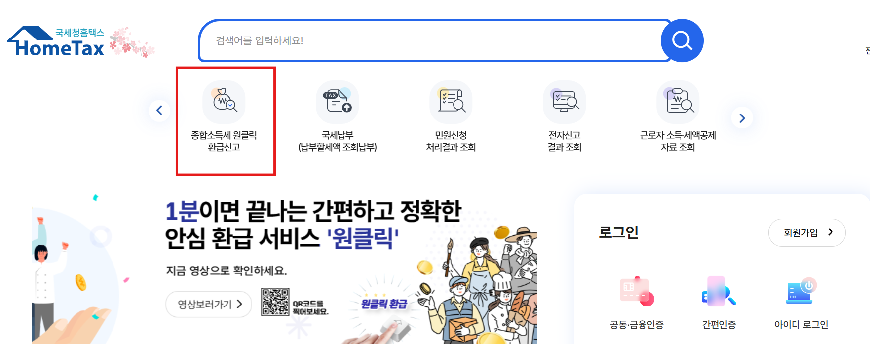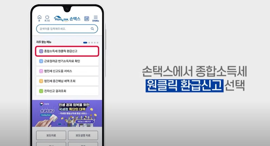 홈택스 첫 화면에 보이는 ‘원클릭 환급 신고’ 배너를 클릭합니다. 이 버튼을 통해 바로 환급 신청 화면으로 이동할 수 있습니다.
