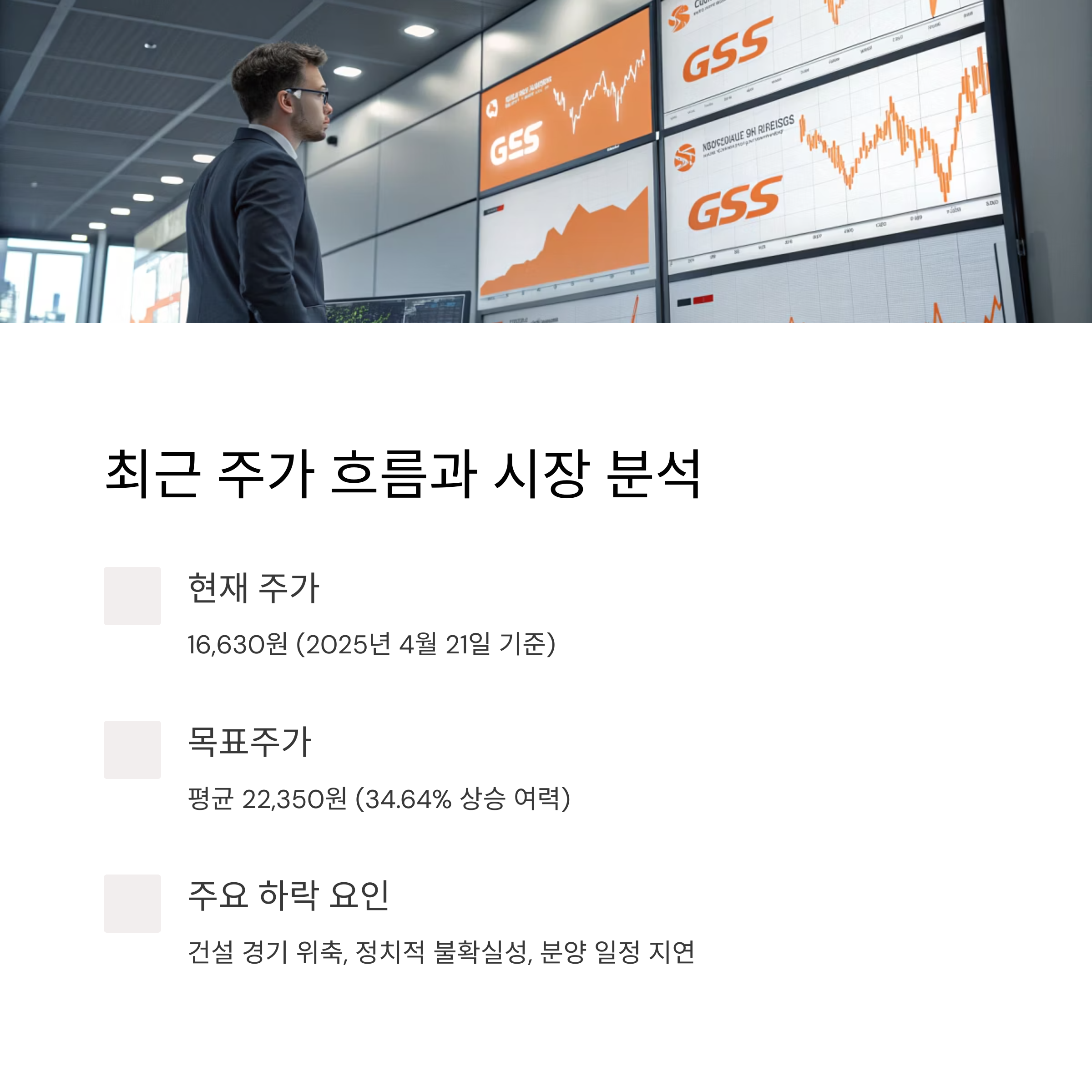 2025년 현재, 건설 경기 부진과 분양 시장의 불안정성이 지속되는 가운데에서도 실적 방어와 사업 구조 개편을 통해 중장기 성장을 꾀하고 있는 GS건설의 주가 전망에 대해 자세히 알아보겠습니다.