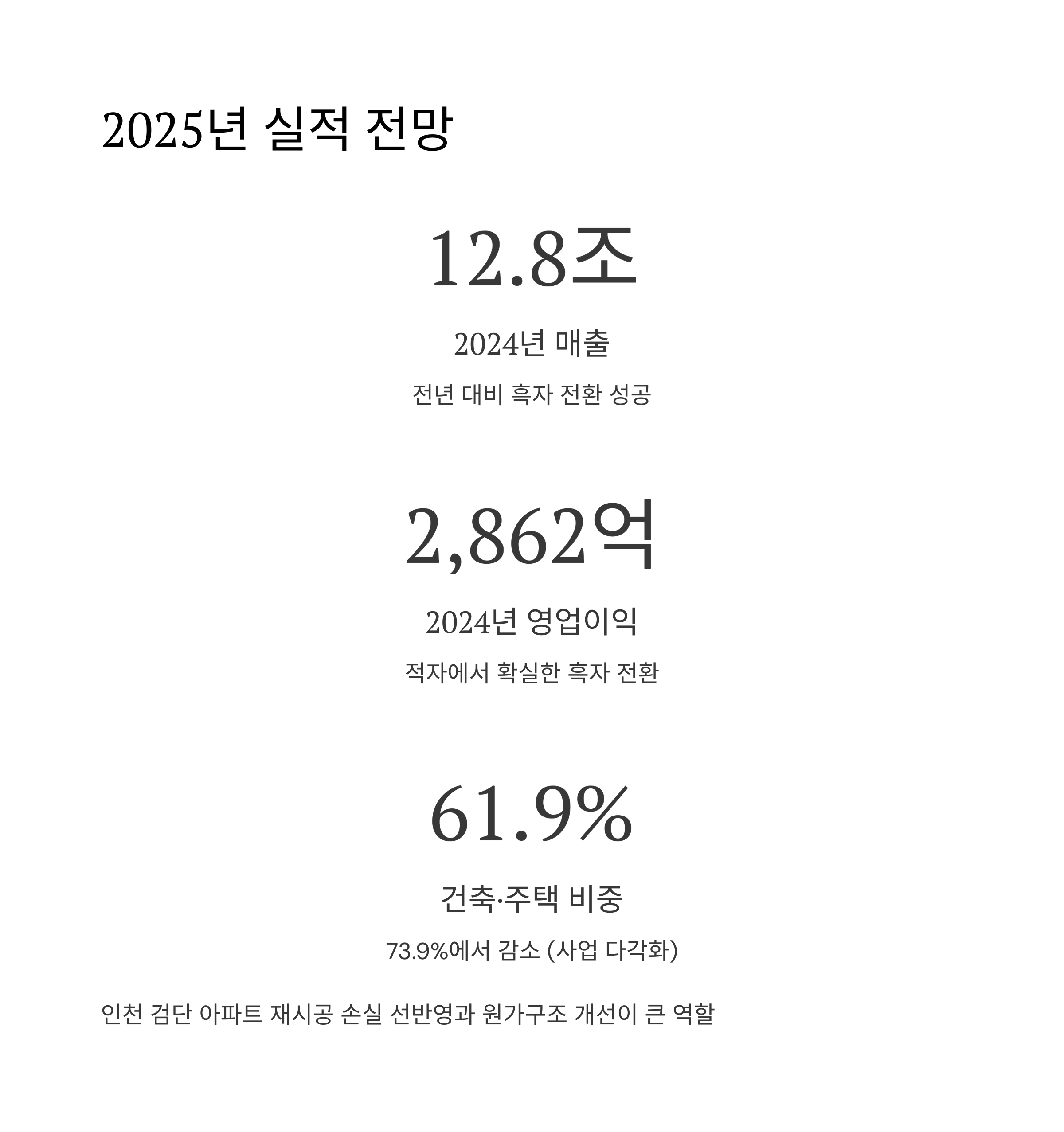 GS건설은 2024년 12조8,638억 원의 매출과 2,862억 원의 영업이익을 기록하며, 전년도 적자에서 확실한 흑자 전환에 성공했습니다. 특히 인천 검단 아파트 재시공 손실 선반영과 원가구조 개선이 큰 역할을 했습니다.