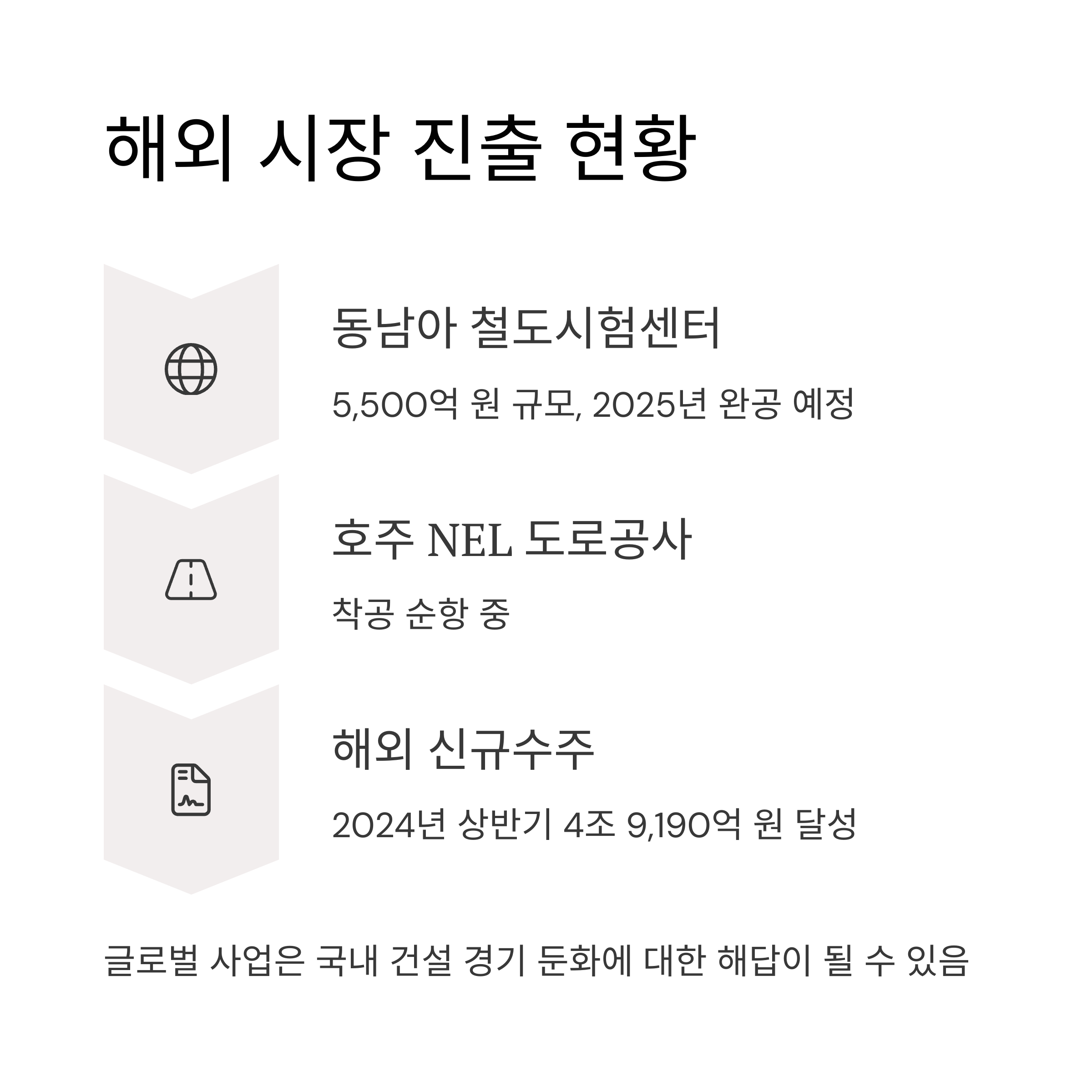 이러한 글로벌 사업은 국내 건설 경기 둔화에 대한 해답이 될 수 있으며, 주가 재평가의 핵심 요인이 될 전망입니다.