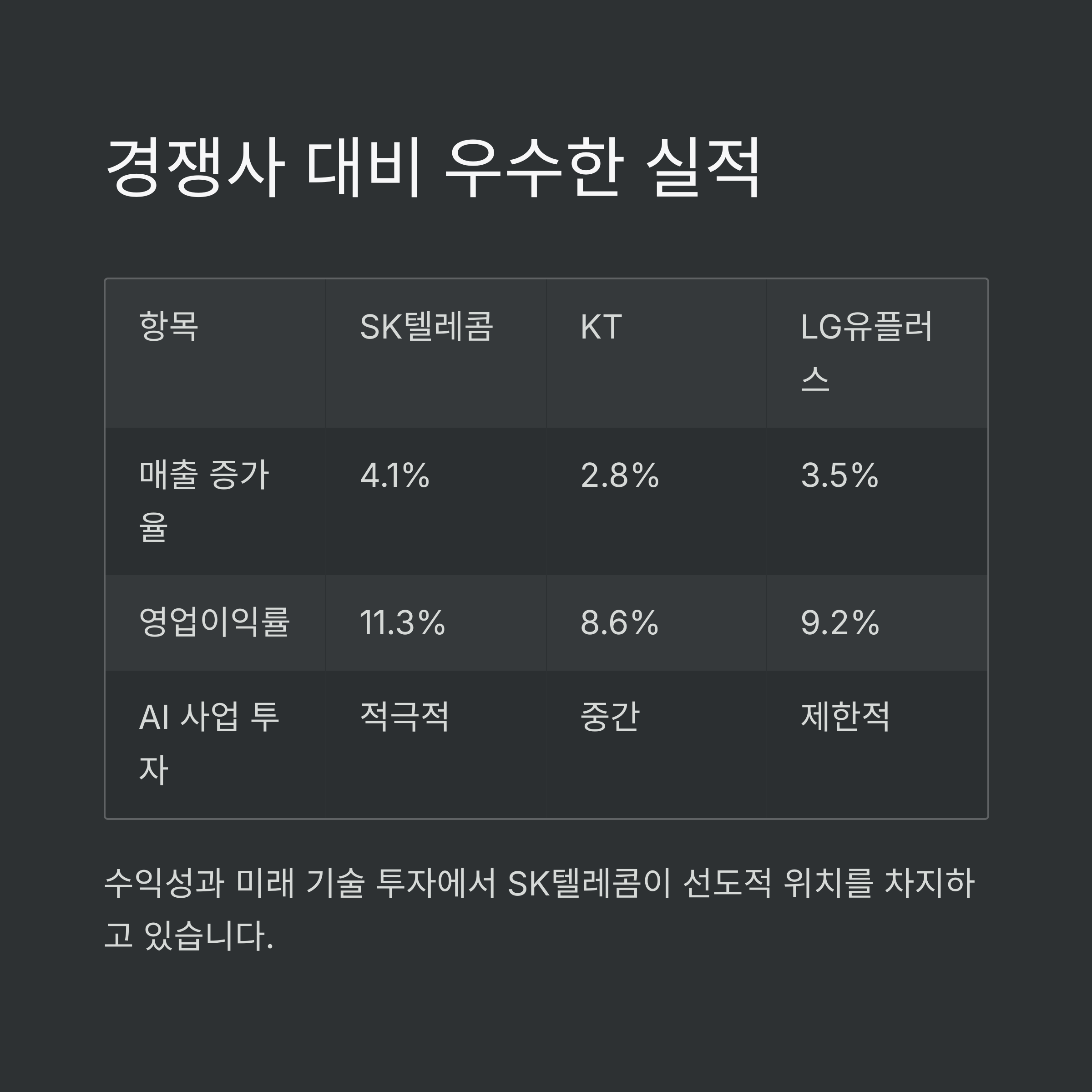 이 표에서 알 수 있듯이 수익성과 미래 기술 투자에서 SK텔레콤이 선도적입니다.