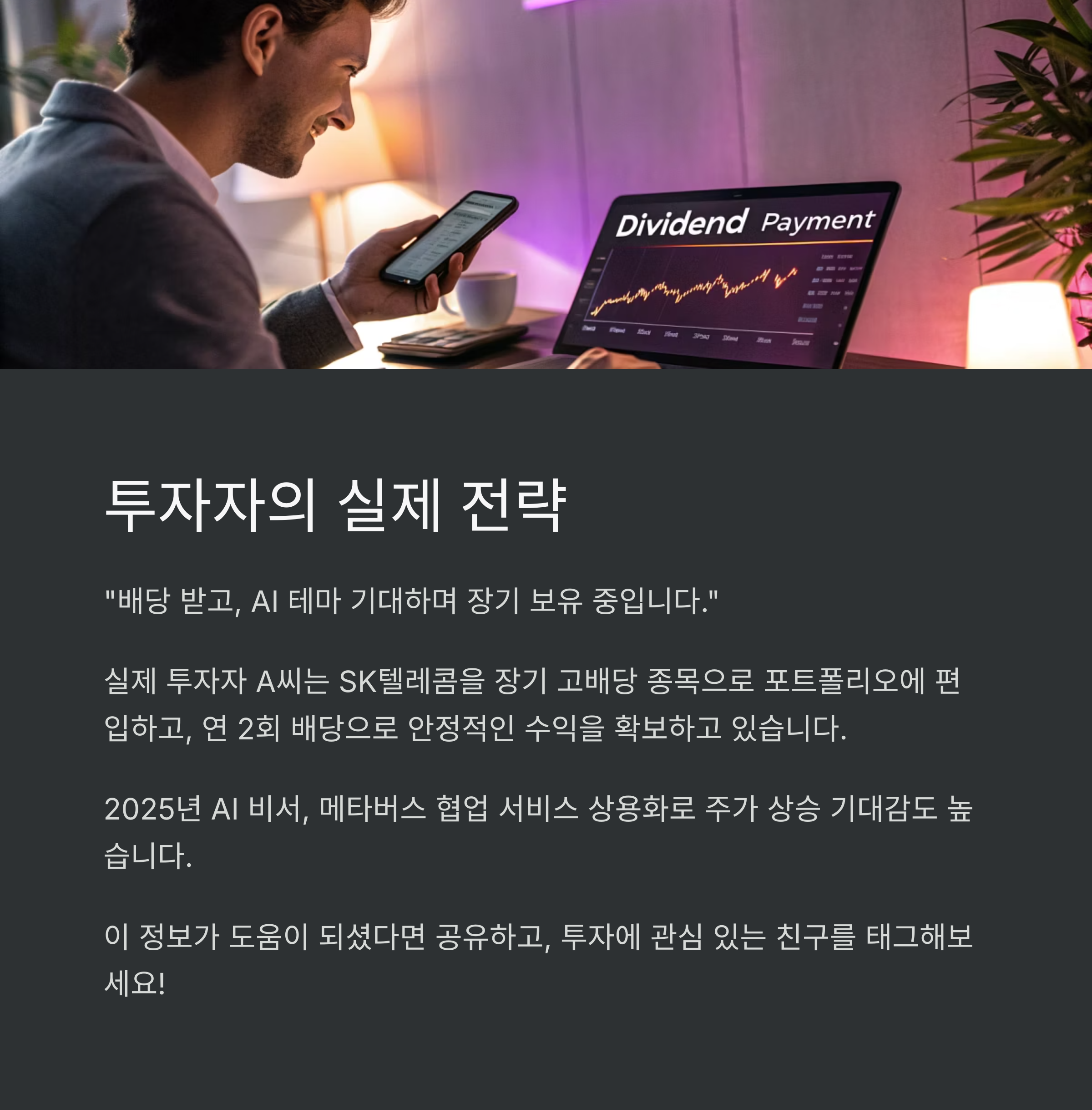 실제 투자자 A씨는 SK텔레콤을 장기 고배당 종목으로 포트에 편입하고 있으며, 매년 2회 배당으로 안정적인 수익을 확보하고 있다고 합니다.