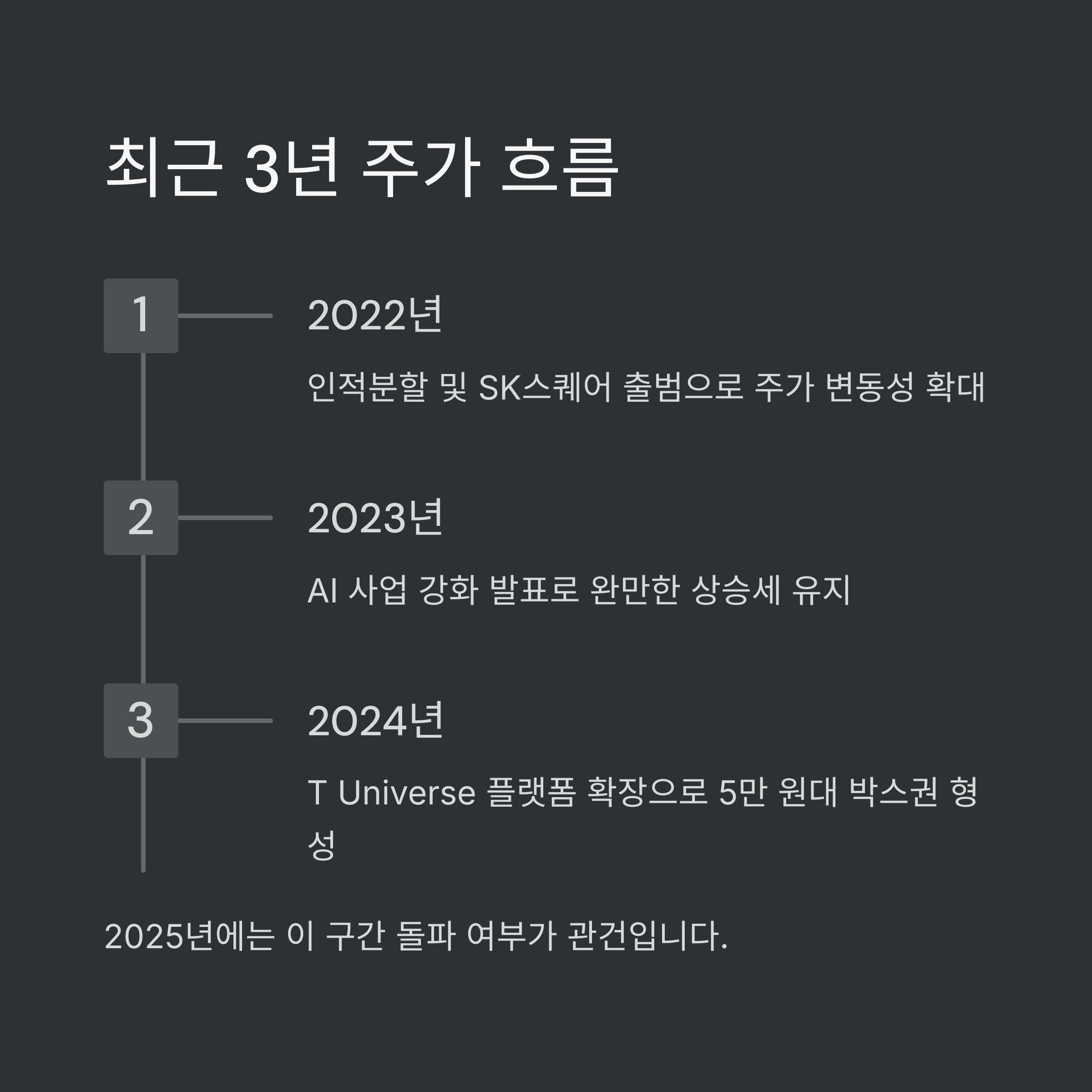| 2024 | T Universe 플랫폼 확장 | 안정적 박스권 유지 |