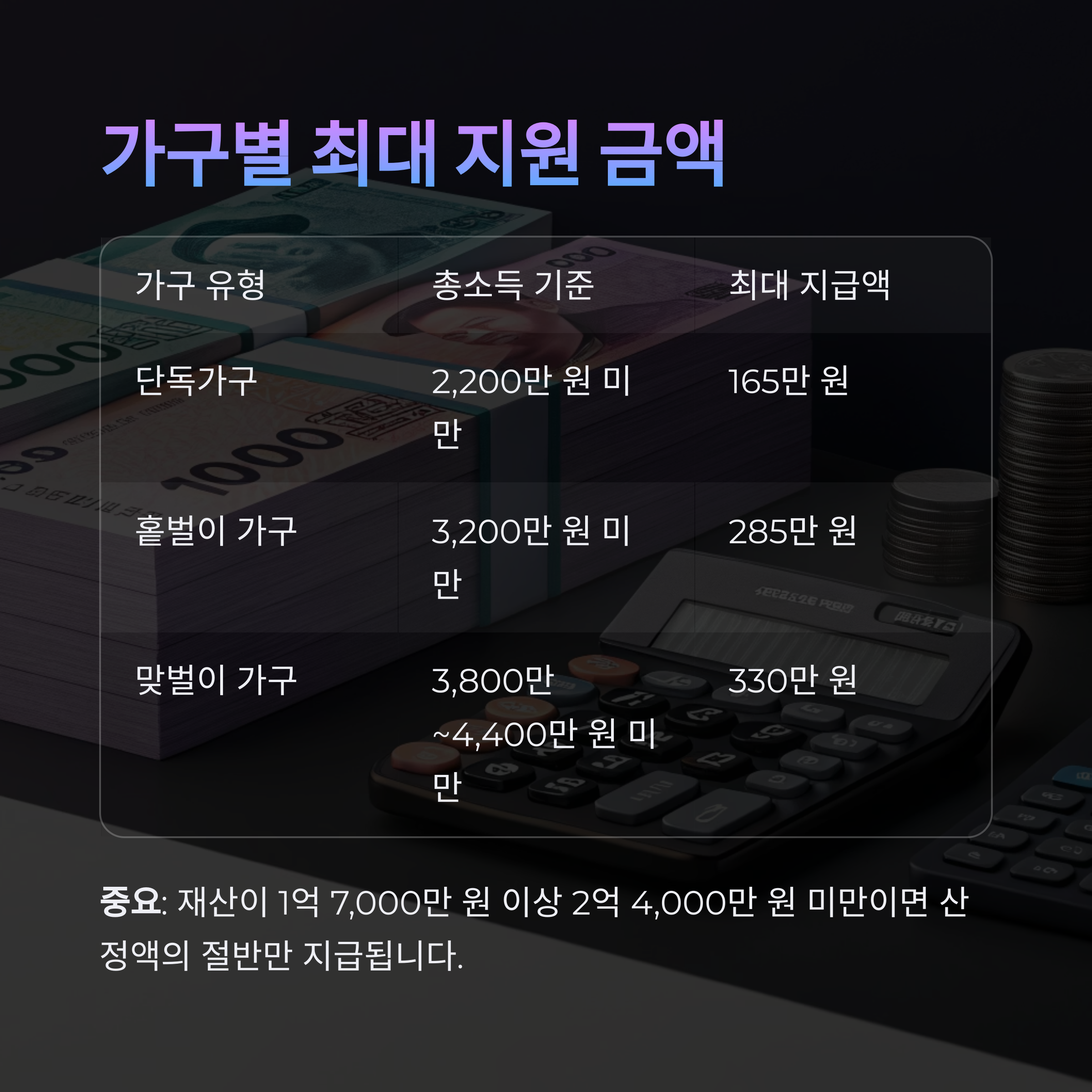 | 가구 유형 | 총소득 기준금액 | 최대 지급액 |