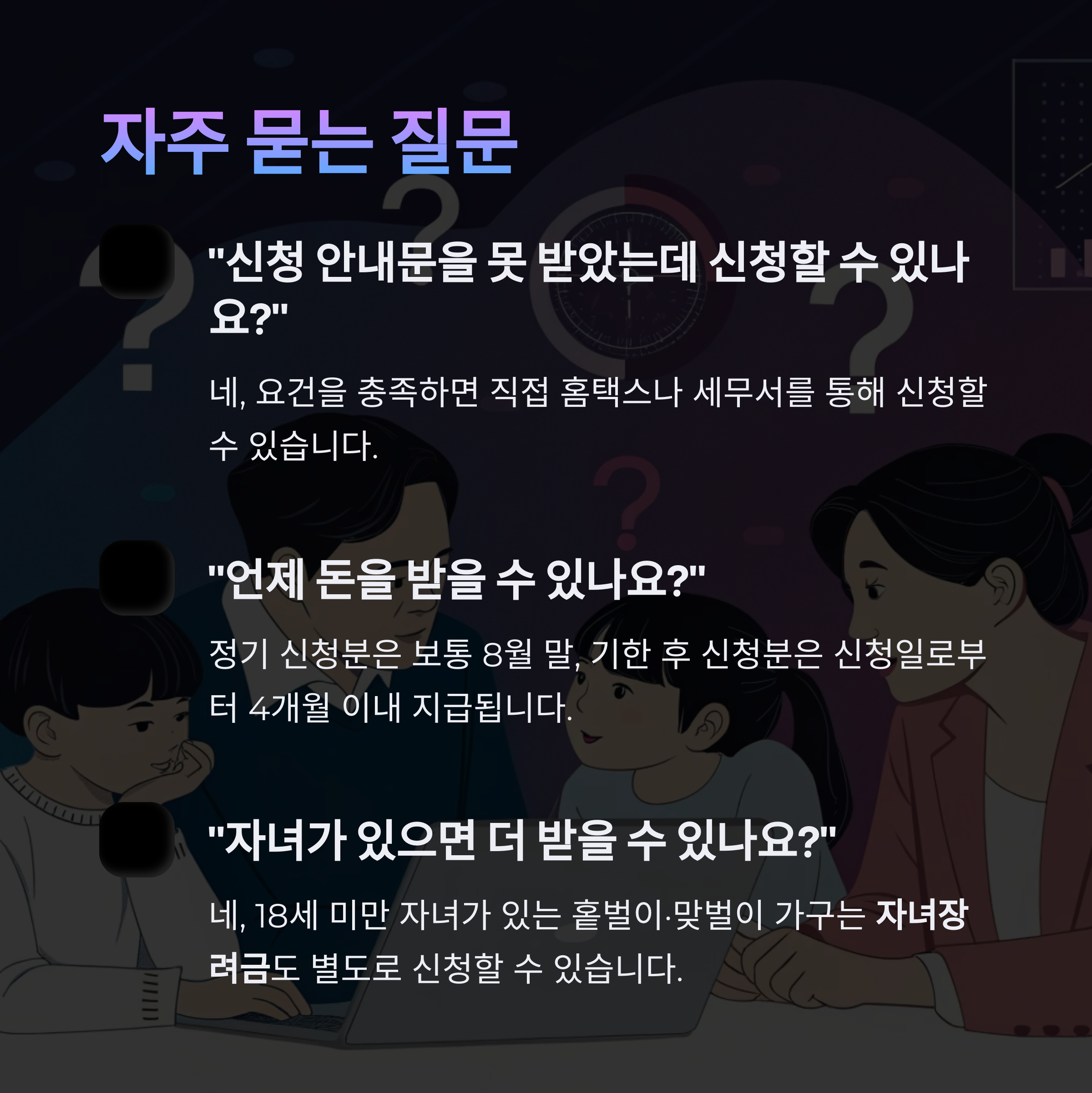 홈택스, 모바일앱, ARS 등으로 간편하게 신청할 수 있으며, 지급액은 가구 유형과 소득 수준에 따라 달라집니다.