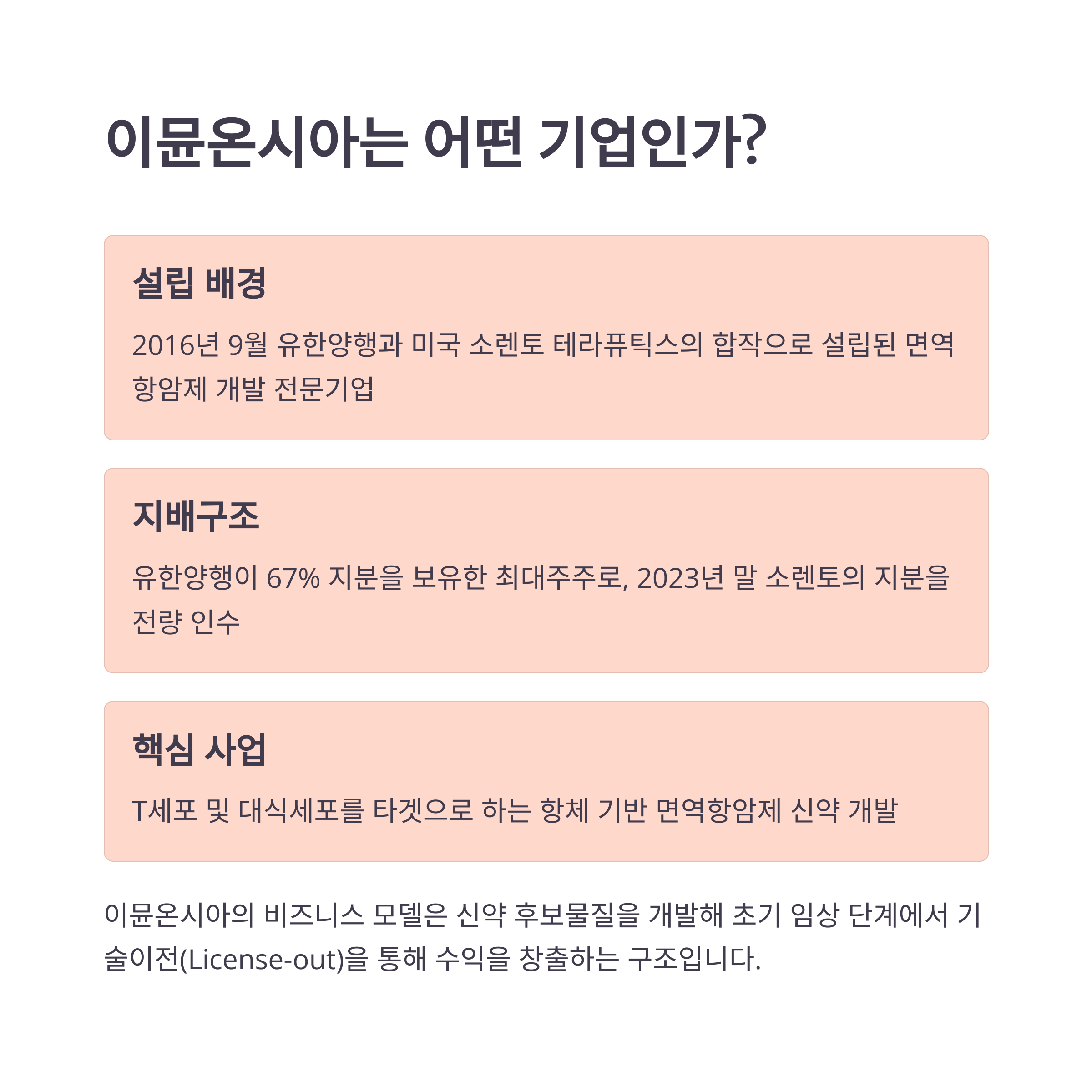 이뮨온시아는 2016년 유한양행과 미국 소렌토 테라퓨틱스가 공동 설립한 면역항암제 기업으로, 현재는 유한양행이 단독 최대주주로 자리하고 있습니다.
