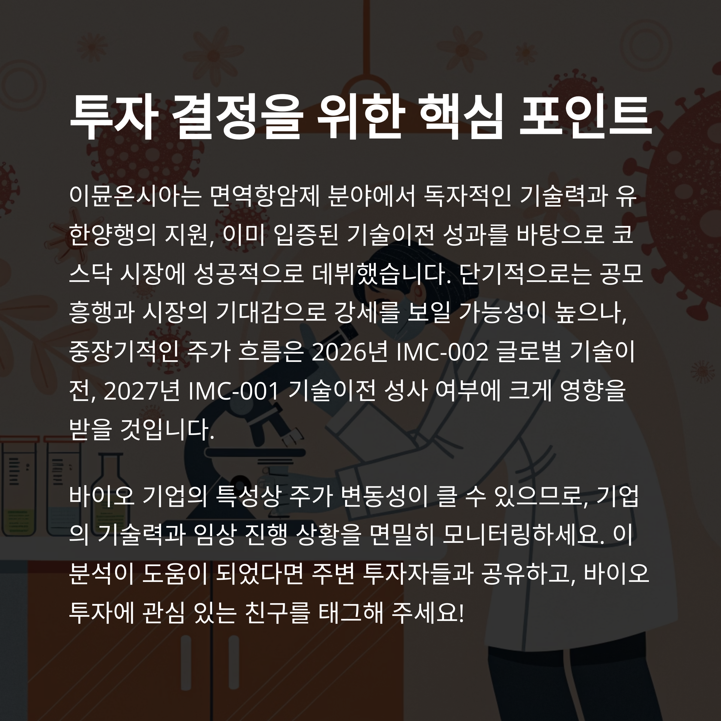 이뮨온시아는 면역항암제를 개발하는 바이오 전문기업으로, 2025년 5월 19일 코스닥에 상장하며 시장의 뜨거운 관심을 받았습니다. 상장 첫날 공모가 대비 100% 이상 급등한 주가 흐름은 기술력과 기대감을 반영한 결과로 해석됩니다. 본문에서는 이뮨온시아의 핵심 기술, 상장 과정, 주가 전망, 그리고 향후 성장 전략을 다양한 각도에서 분석합니다.