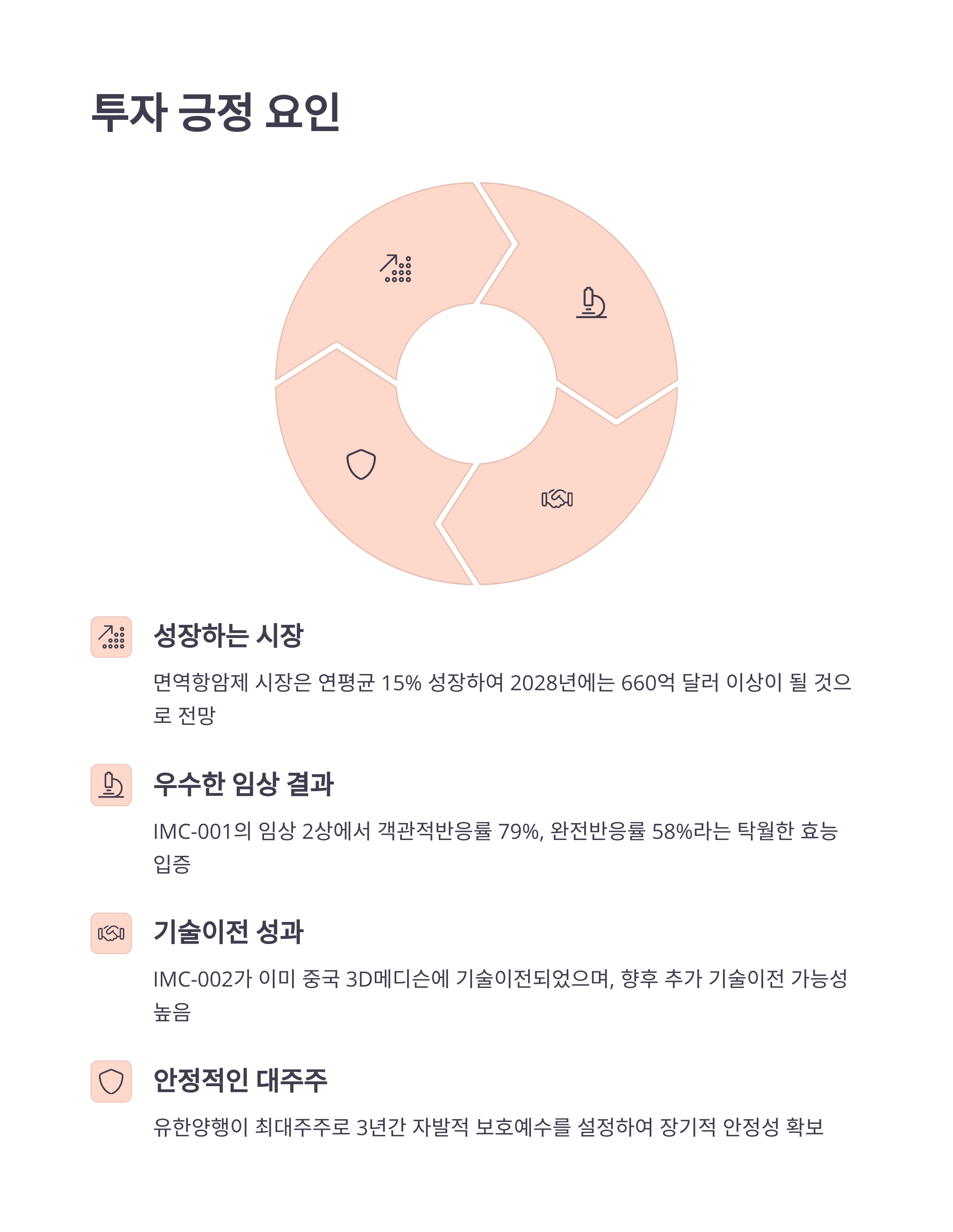 | 낙관적 | IMC-001/002 기술이전 성공 | 지속적 상승 | 밸류에이션 부담 |