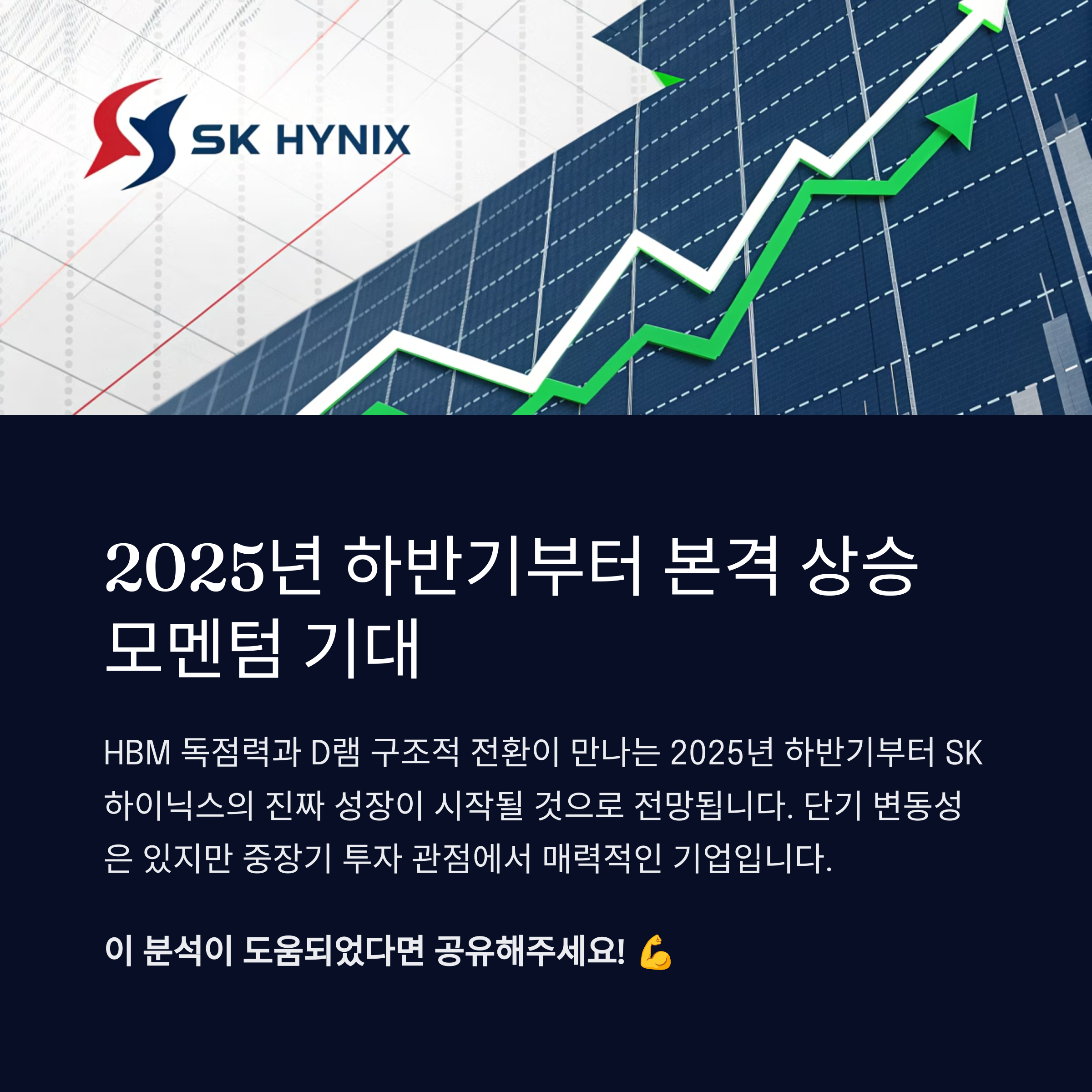 AI 인프라 수요 폭증과 고부가가치 HBM 제품 중심의 포트폴리오 확대가 SK하이닉스의 중장기 성장 기대를 견인합니다. 다만, 단기적으로는 관세 리스크와 글로벌 경기 변동성에 따른 주가 조정 가능성도 염두에 두어야 합니다.