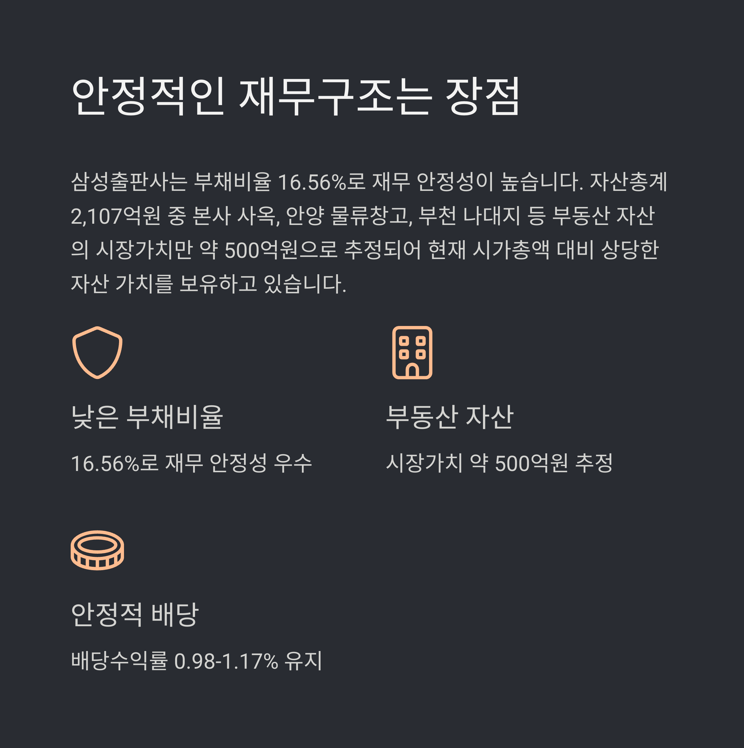 삼성출판사는 부채비율 16.56%로 매우 안정적인 재무구조를 갖추고 있으며,