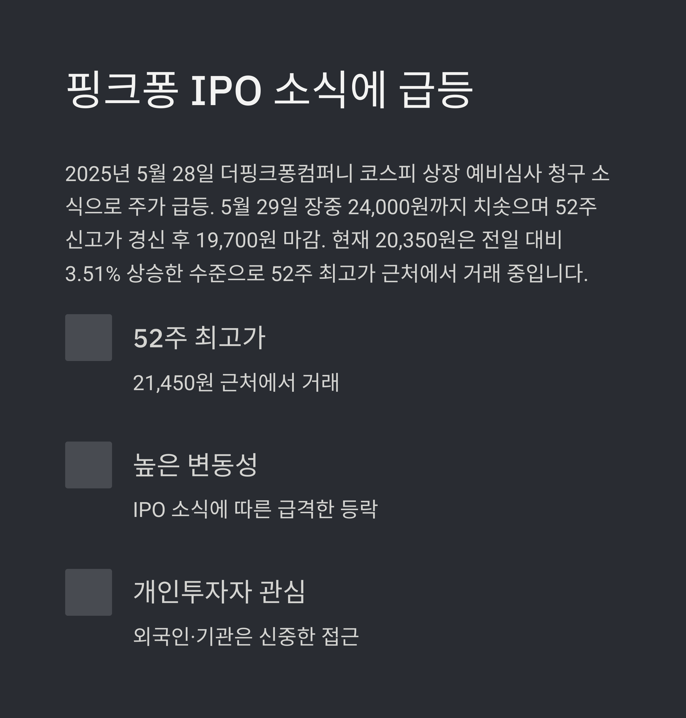 상장 일정 지연 시 단기 조정 가능성이 존재합니다."