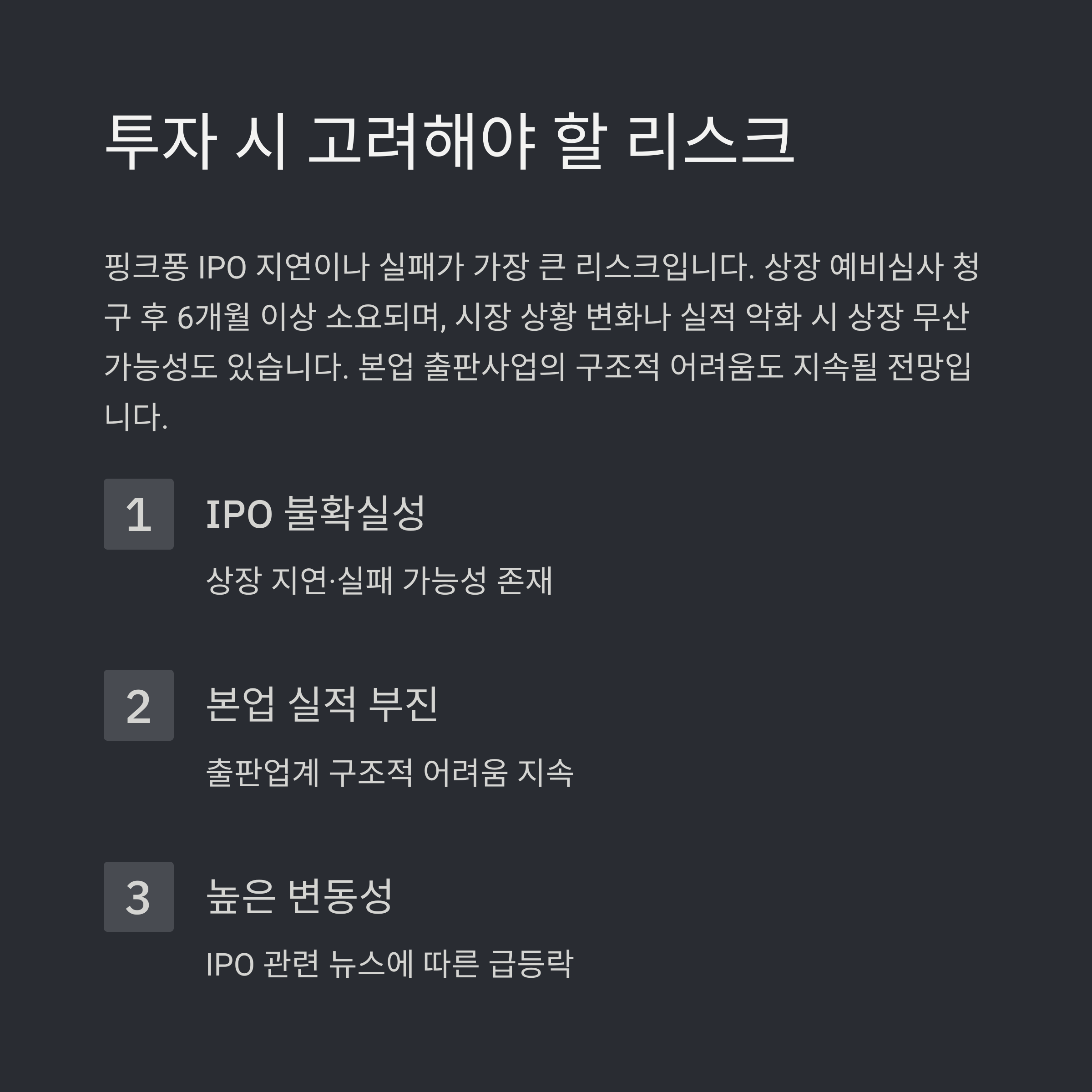 핵심 리스크는 더핑크퐁컴퍼니의 IPO 지연 또는 무산 가능성입니다.