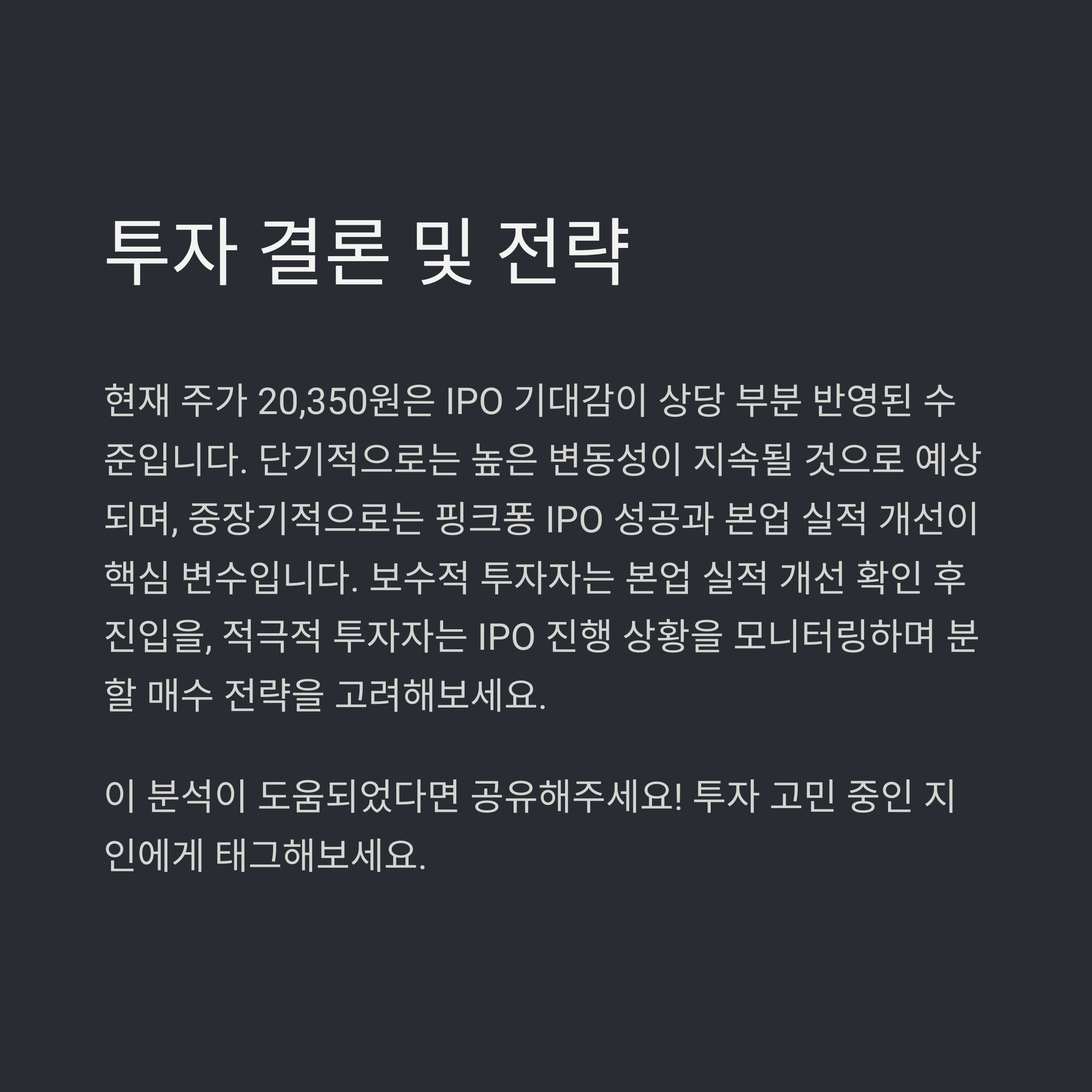반면, 핵심 기회 요인은 더핑크퐁컴퍼니의 상장 성공을 통한 막대한 투자 수익 확보입니다.