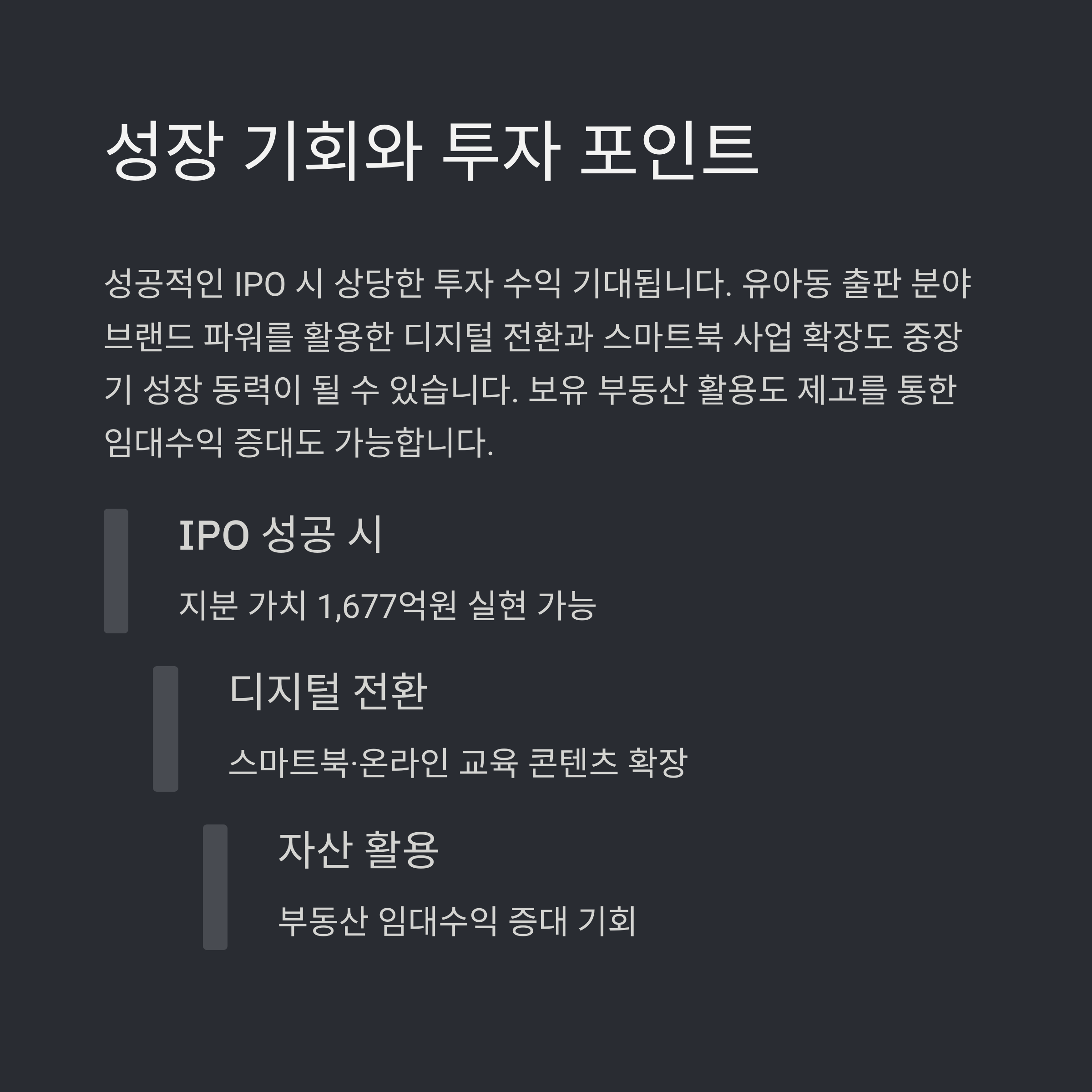 또한 보유 부동산의 유동화, 디지털 콘텐츠 전환을 통한 신성장 전략 등도 중장기 기회로 작용할 수 있습니다.