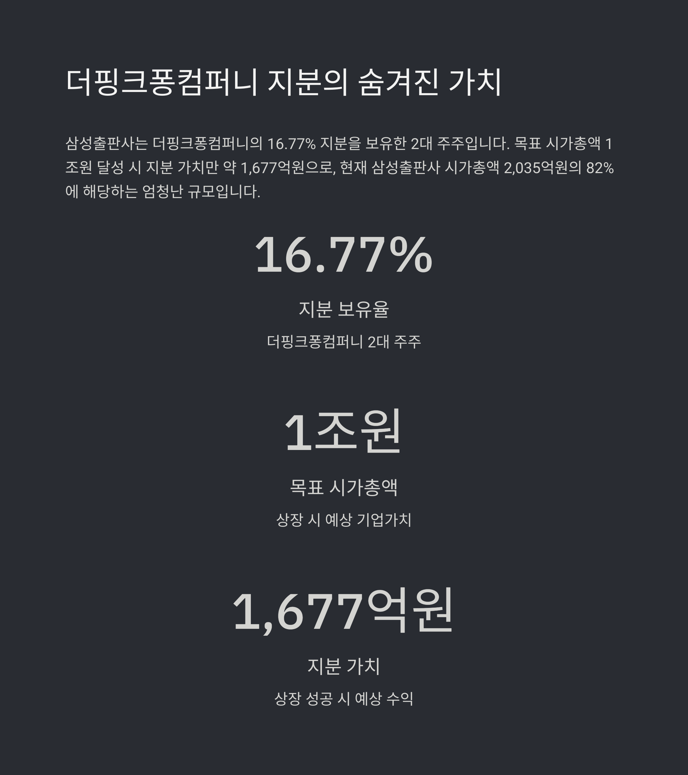 즉, 더핑크퐁컴퍼니의 성공적인 상장은 삼성출판사 기업가치의 핵심 축을 형성합니다.