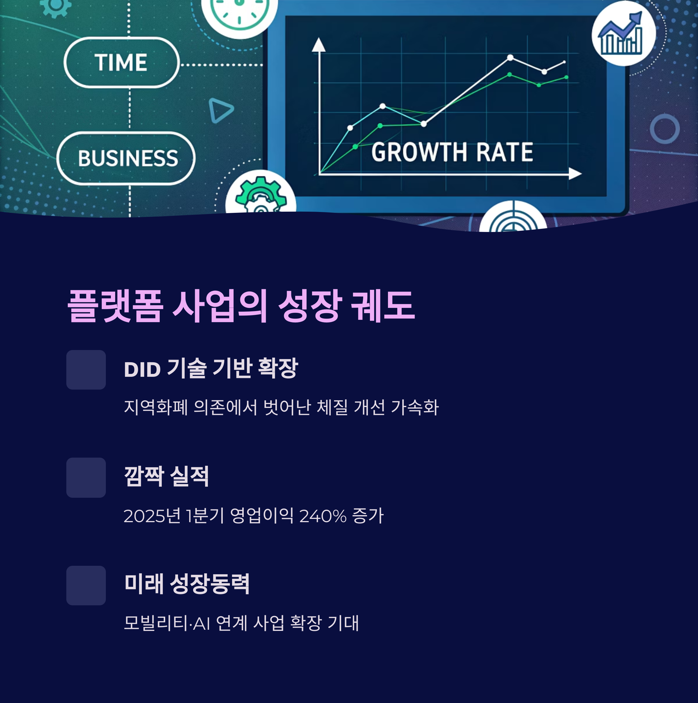 2025년 1분기 기준 매출 582억 9,000만원, 영업이익 125억 6,700만원을 기록하며 수익성이 급격히 개선됐습니다. 이는 DID 사업의 고수익 구조와 플랫폼 수수료 수익 모델 강화 덕분입니다.