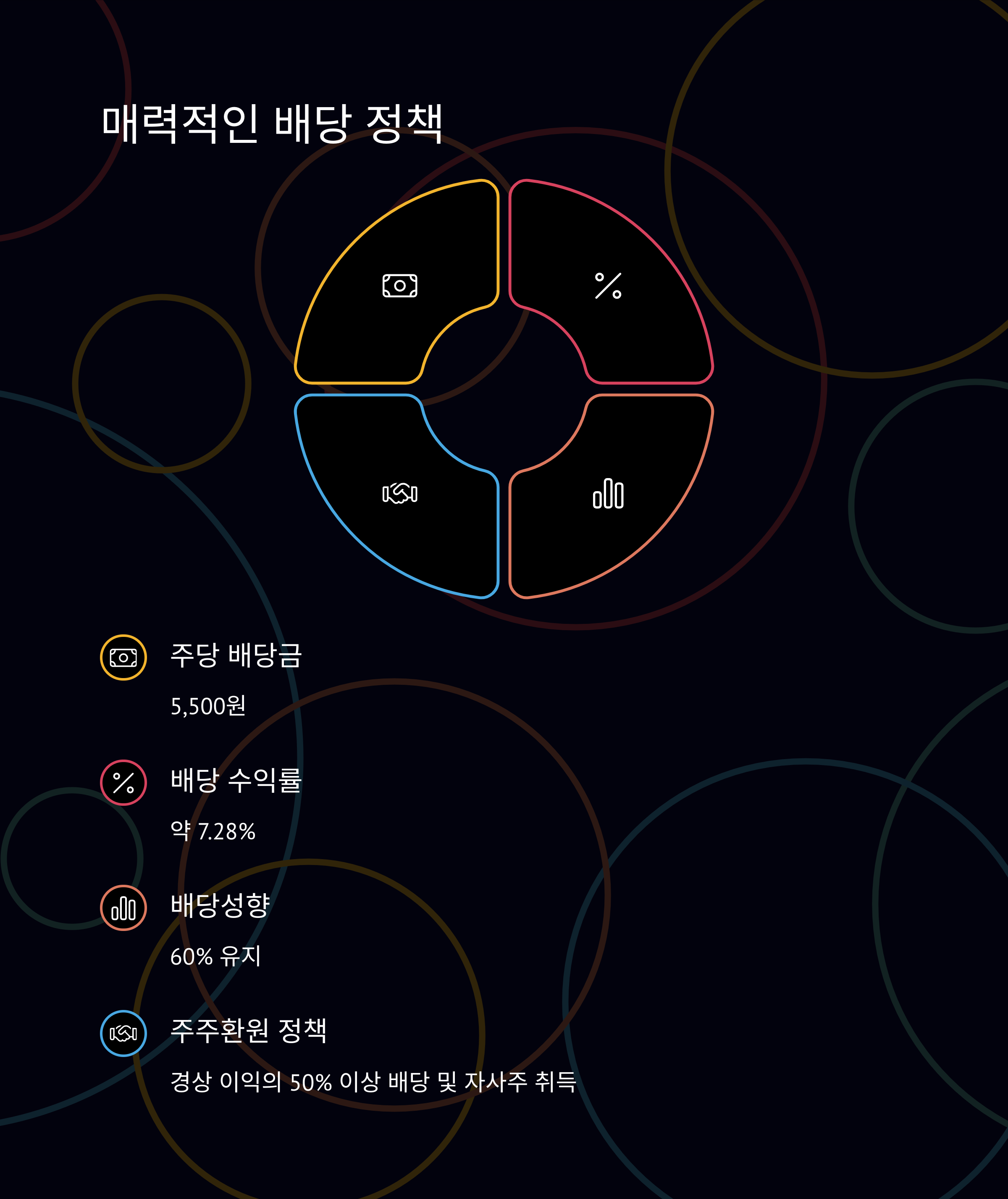 주당 배당금 5,500원, 배당 수익률 약 7.28%로 배당주 투자자들에게 매우 매력적인 조건을 제시하고 있습니다. 배당성향 60% 유지, 중간·분기 배당 도입, 자사주 소각 없이도 시가배당 7.8% 수준의 수익을 유지하고 있습니다. "경상 이익의 50% 이상을 배당 및 자사주 취득에 사용"이라는 적극적인 주주환원 정책은 방어적 투자처로서의 가치를 높입니다.