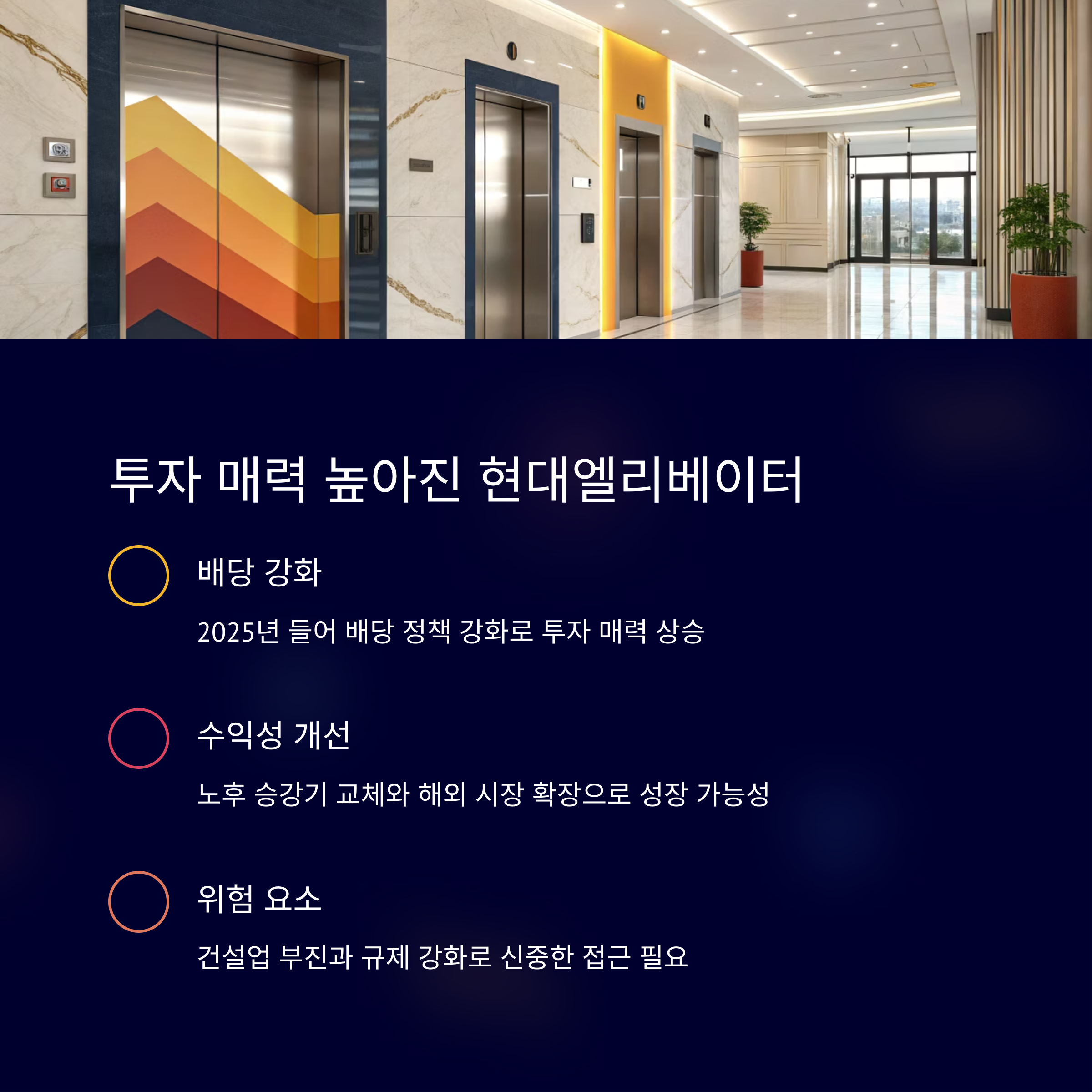 현대엘리베이터는 2025년 들어 배당 강화와 수익성 개선 흐름을 바탕으로 투자 매력을 높이고 있습니다. 노후 승강기 교체 수요와 해외 시장 확장 등 중장기 성장 가능성도 긍정적입니다. 다만 건설업 부진과 규제 강화 등 위험 요소도 존재해, 신중한 접근이 필요합니다.