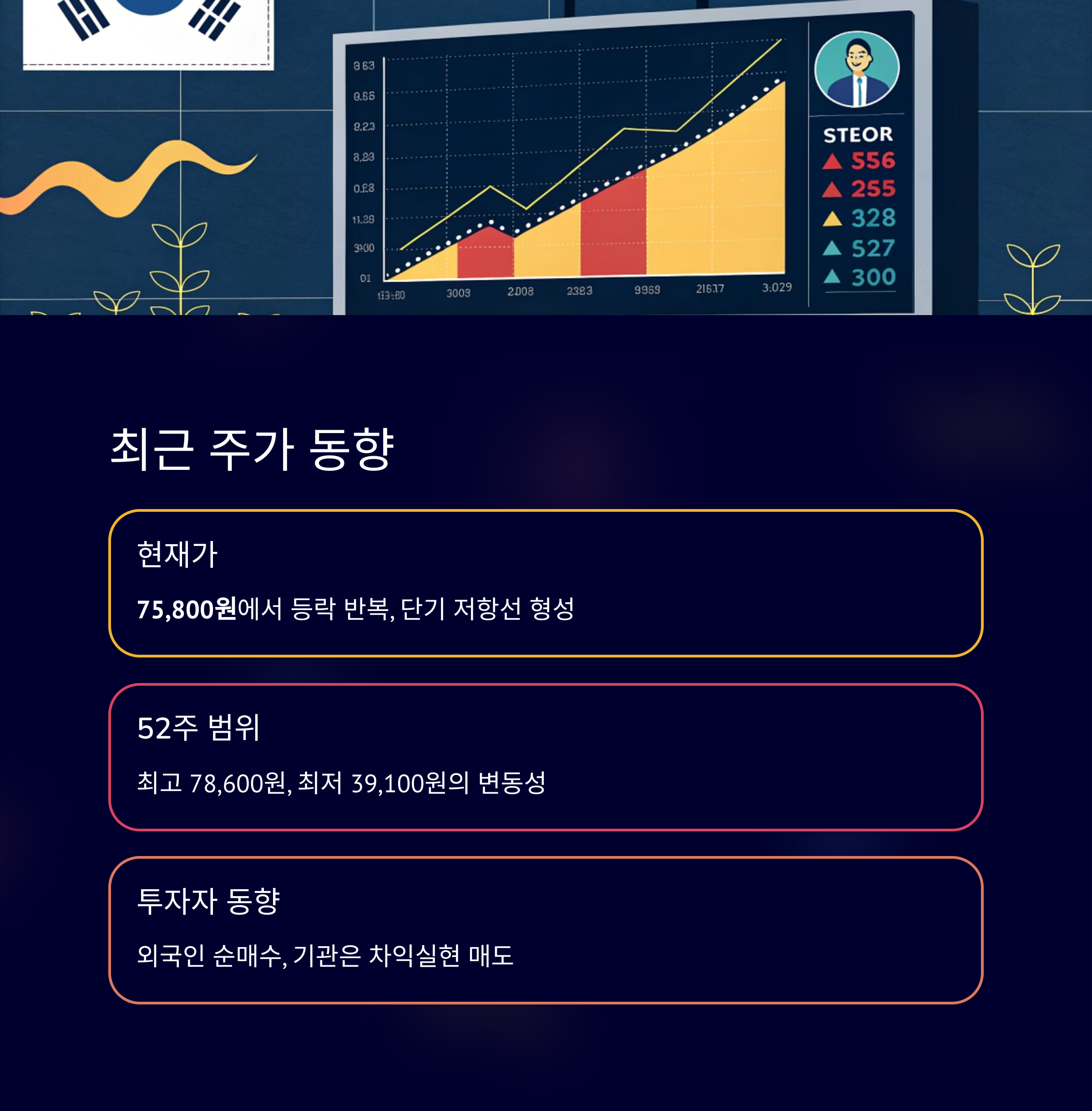 현대엘리베이터의 주가는 75,800원에서 등락을 반복하며 단기적인 저항선을 형성하고 있습니다. 52주 최고가는 78,600원, 최저가는 39,100원으로 변동성이 컸지만 최근에는 배당 안정성과 실적 호조에 따라 안정적인 흐름을 보이고 있습니다. 외국인은 순매수세를 유지하고 있으며, 기관은 차익실현 매도로 단기 변동성을 높이고 있습니다.