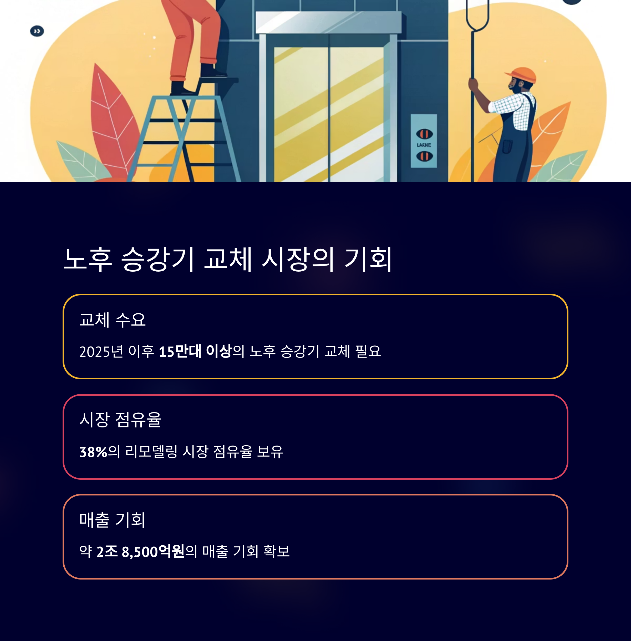 2025년 이후 국내에는 15만대 이상의 노후 승강기 교체 수요가 존재하며 현대엘리베이터는 38%의 리모델링 시장 점유율로 약 2조 8,500억원의 매출 기회를 확보하고 있습니다. 기술·안전 기준 강화를 통해 정밀검사 및 안전설비 교체 수요가 지속 확대될 것으로 예상됩니다.