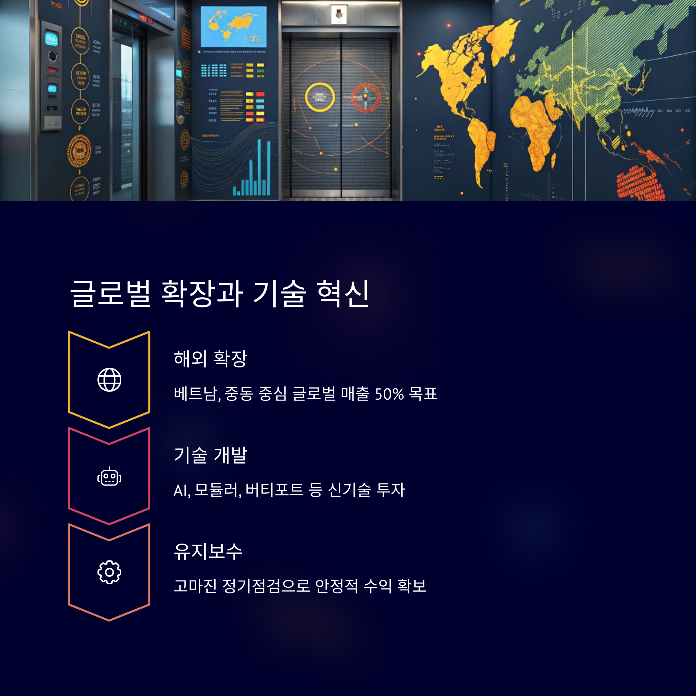현대엘리베이터는 글로벌 매출 비중 50% 달성을 목표로 베트남, 중동 시장을 중심으로 수주 확대를 추진 중입니다. 또한, 삼성물산과 초고층 모듈러 승강기 공동개발, AI 기반 운영 시스템 및 버티포트 인프라 구축 등 기술혁신 중심의 신사업도 적극 전개하고 있습니다.