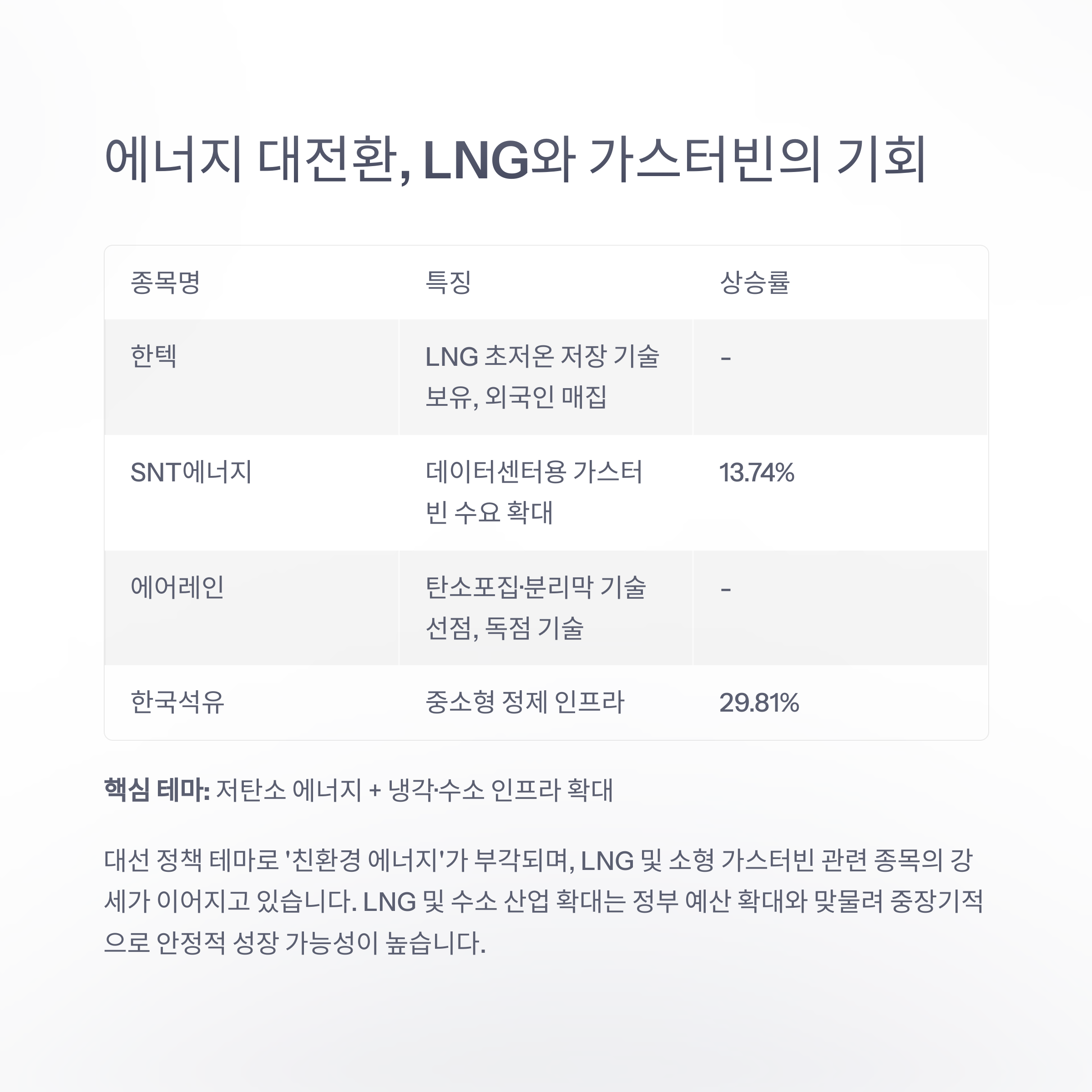 | 종목명 | 특징 | 상승률 |