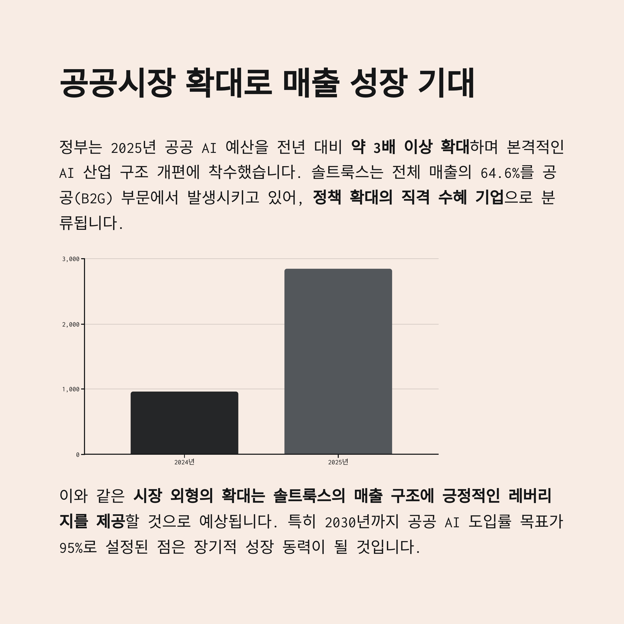 솔트룩스는 전체 매출의 64.6%를 공공(B2G) 부문에서 발생시키고 있어, 정책 확대의 직격 수혜 기업으로 분류됩니다.