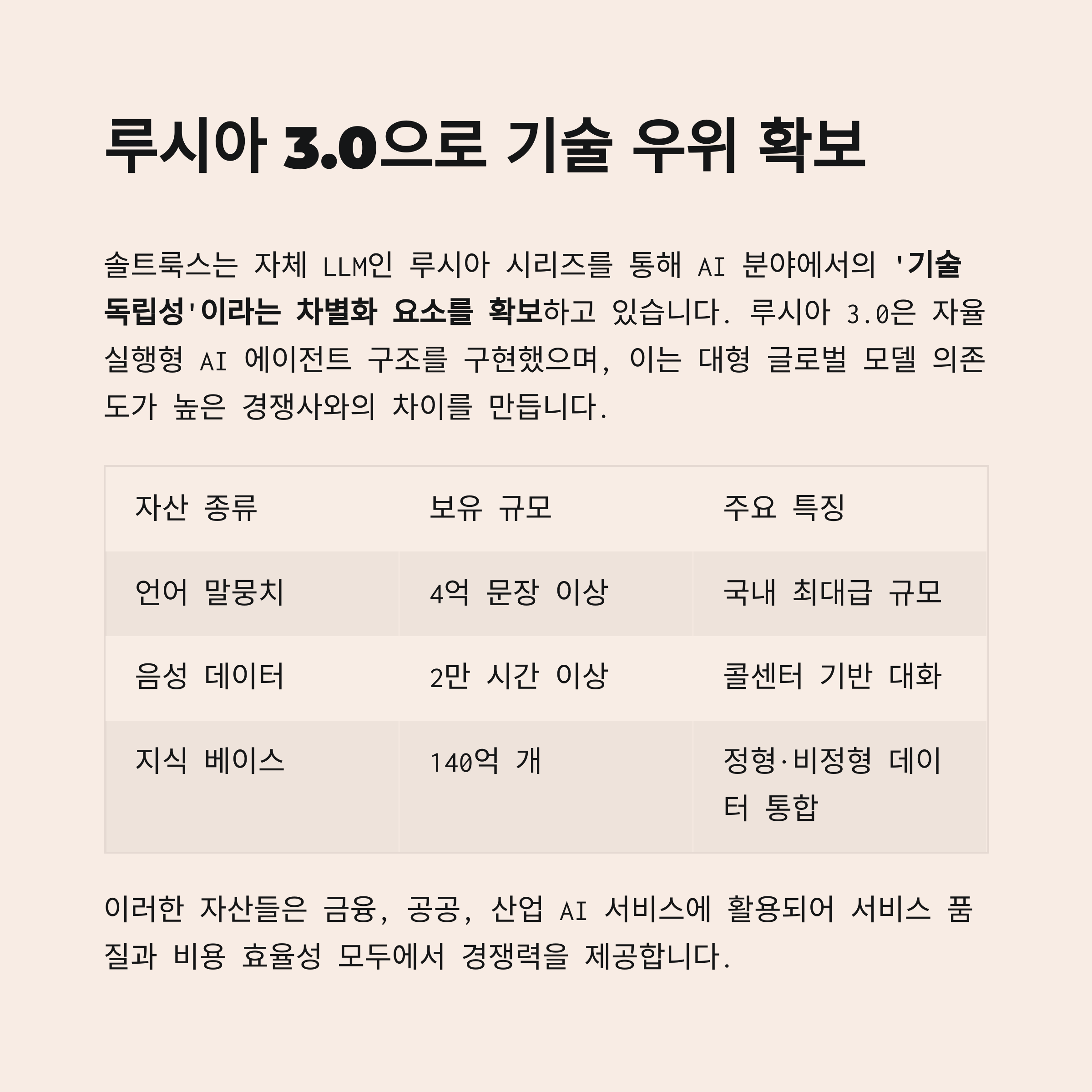솔트룩스는 자체 LLM인 루시아 시리즈를 통해 AI 분야에서의 '기술 독립성'이라는 차별화 요소를 확보하고 있습니다.