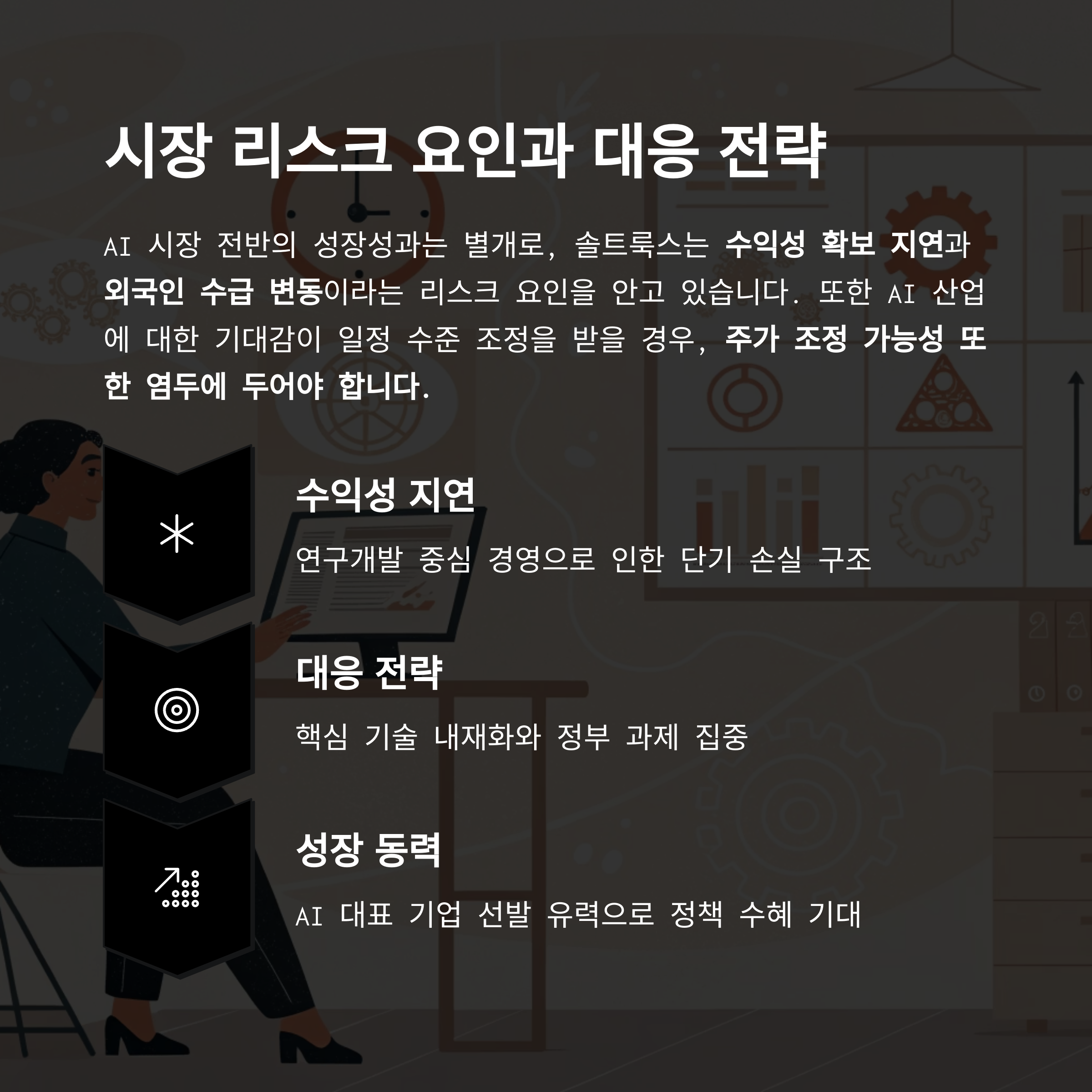 AI 시장 전반의 성장성과는 별개로, 솔트룩스는 수익성 확보 지연과 외국인 수급 변동이라는 리스크 요인을 안고 있습니다.