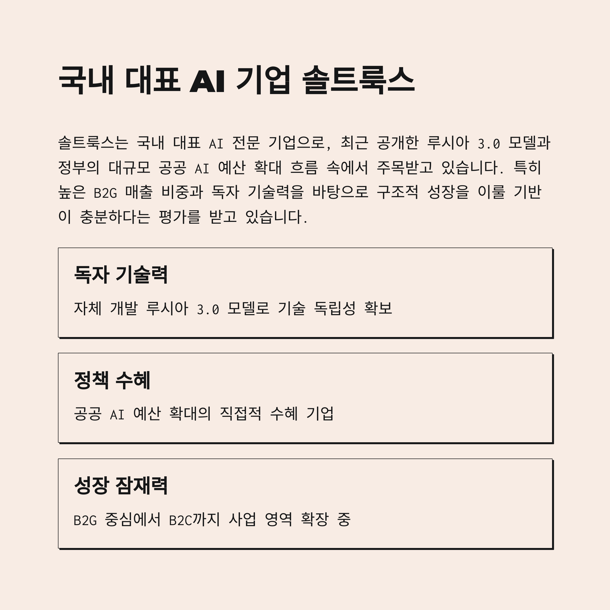 솔트룩스는 국내 대표 AI 전문 기업으로, 최근 공개한 루시아 3.0 모델과 정부의 대규모 공공 AI 예산 확대 흐름 속에서 주목받고 있습니다. 특히 높은 B2G 매출 비중과 독자 기술력을 바탕으로 구조적 성장을 이룰 기반이 충분하다는 평가입니다. 이 글에서는 솔트룩스의 기술력, 정책 수혜 전망, 재무 구조, 그리고 향후 주가 흐름을 종합적으로 분석합니다.
