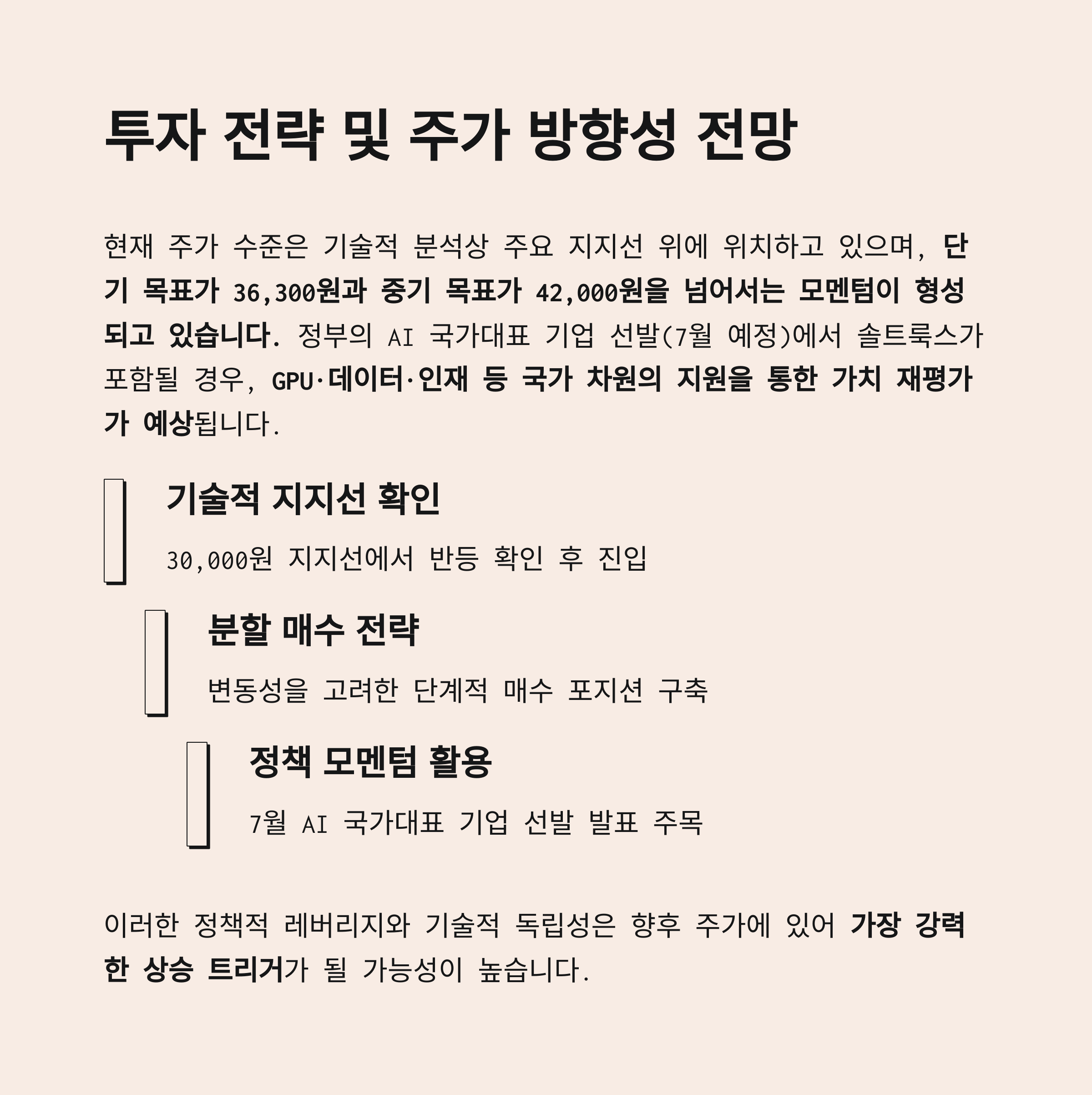 결론적으로, 솔트룩스는 단기 실적 부진이라는 변수를 안고 있으나, 기술력, 정책 수혜, 공공시장 구조적 성장이라는 삼중축을 통해 주가 상승 가능성이 충분히 뒷받침되는 AI 대표 기업입니다. 투자자들은 변동성을 감안한 분할 매수 전략과 함께, 7월 정부 발표 이후를 주목할 필요가 있습니다.