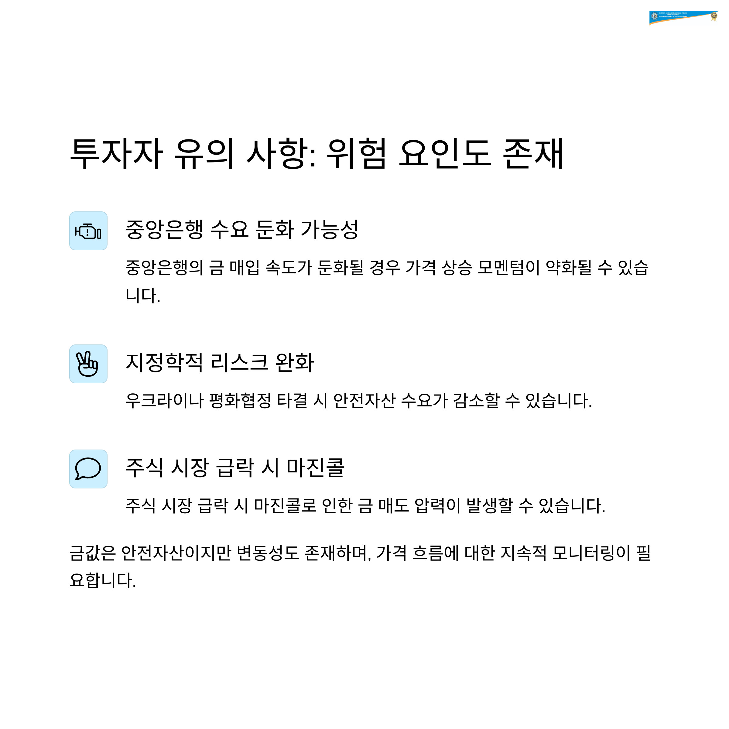 - 주식 시장 급락 시 마진콜로 인한 금 매도 압력