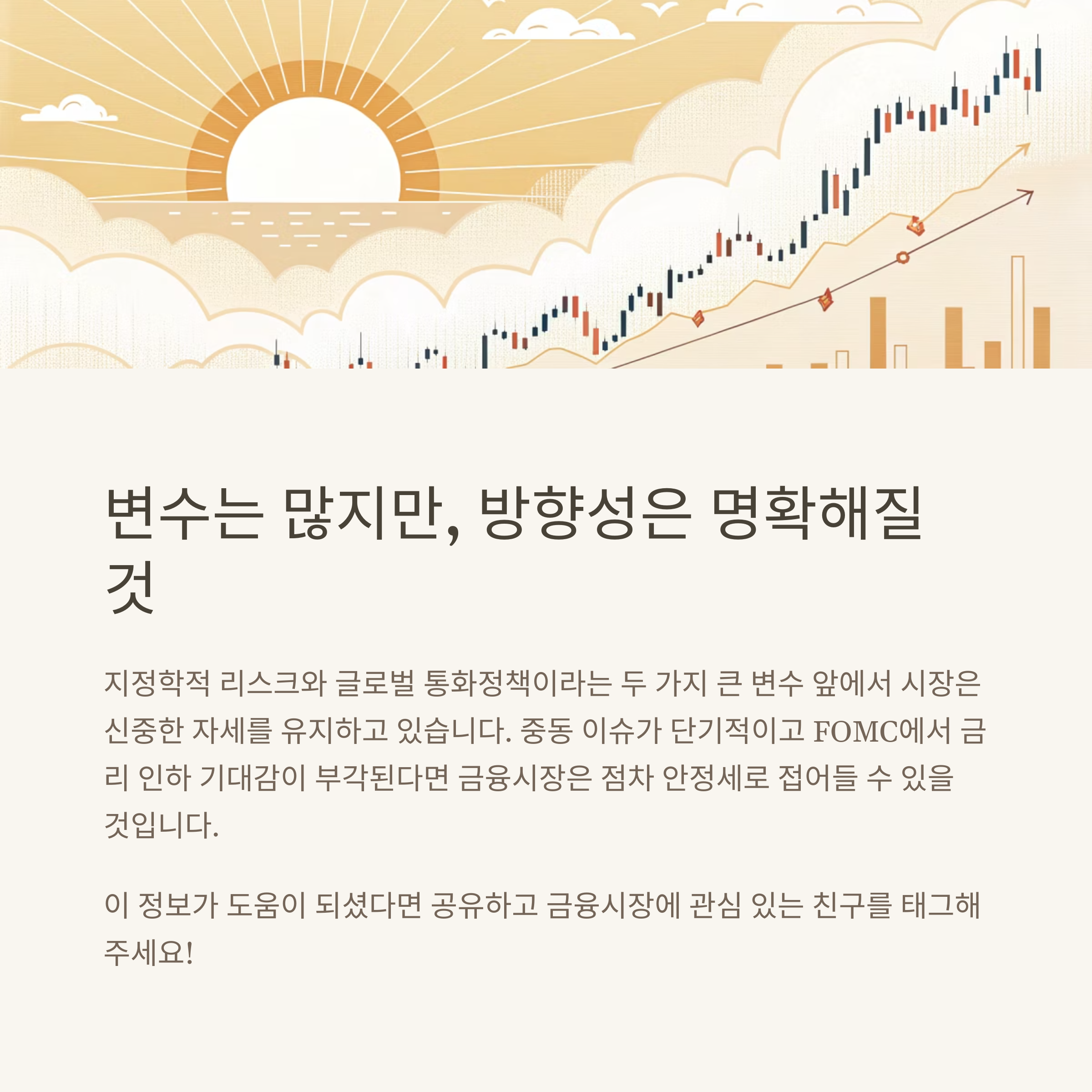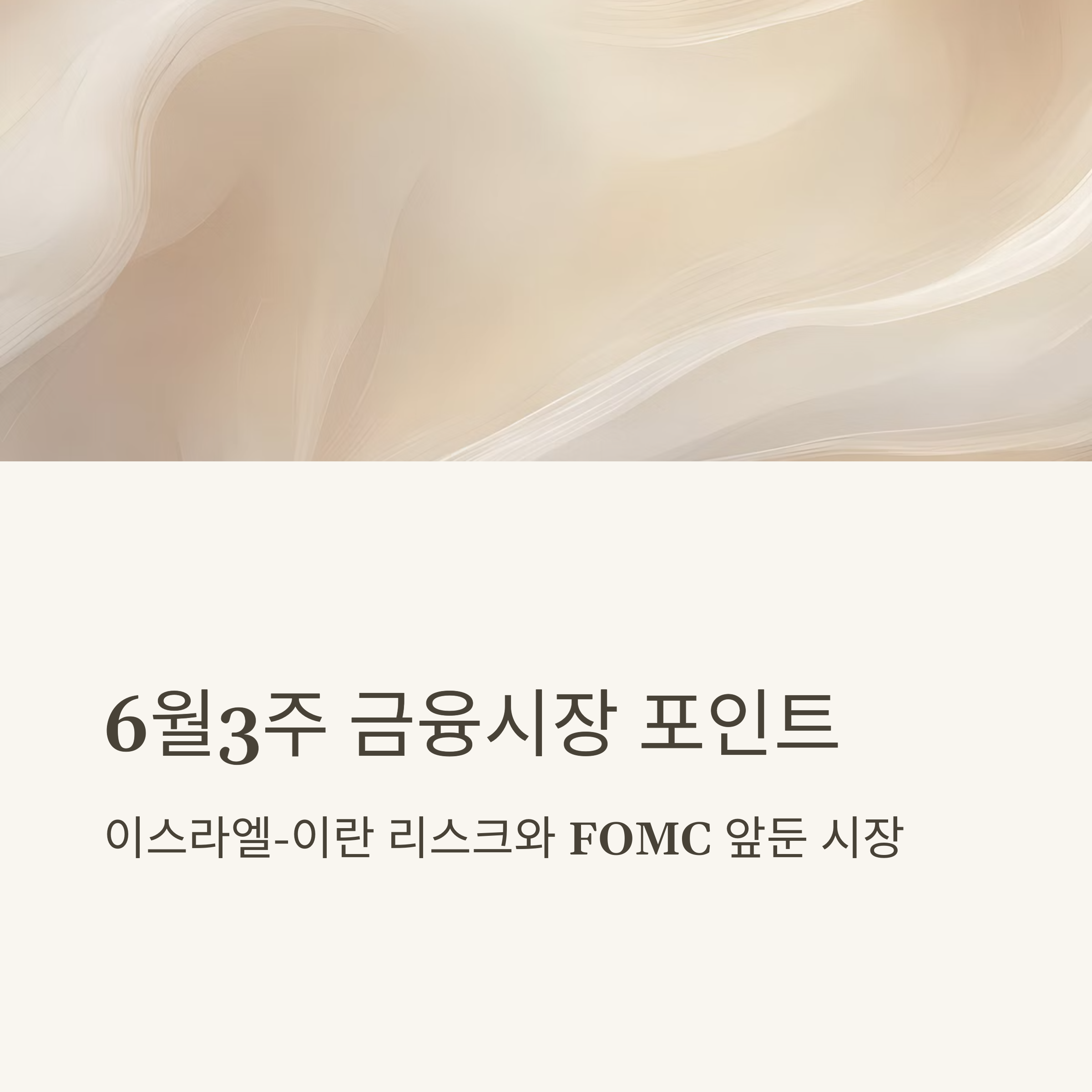 지난주 금융시장은 중동 지정학적 리스크의 확대로 인해 전반적인 약세 흐름을 보였습니다. 이스라엘과 이란 간의 무력 충돌이 본격화되면서 안전자산 선호가 강해졌고, 국제유가 급등과 함께 인플레이션 우려도 커졌습니다. 이번 주는 이러한 지정학적 리스크가 얼마나 지속될지, 그리고 6월 FOMC 회의에서의 통화정책 방향에 시장의 이목이 집중될 것으로 보입니다.