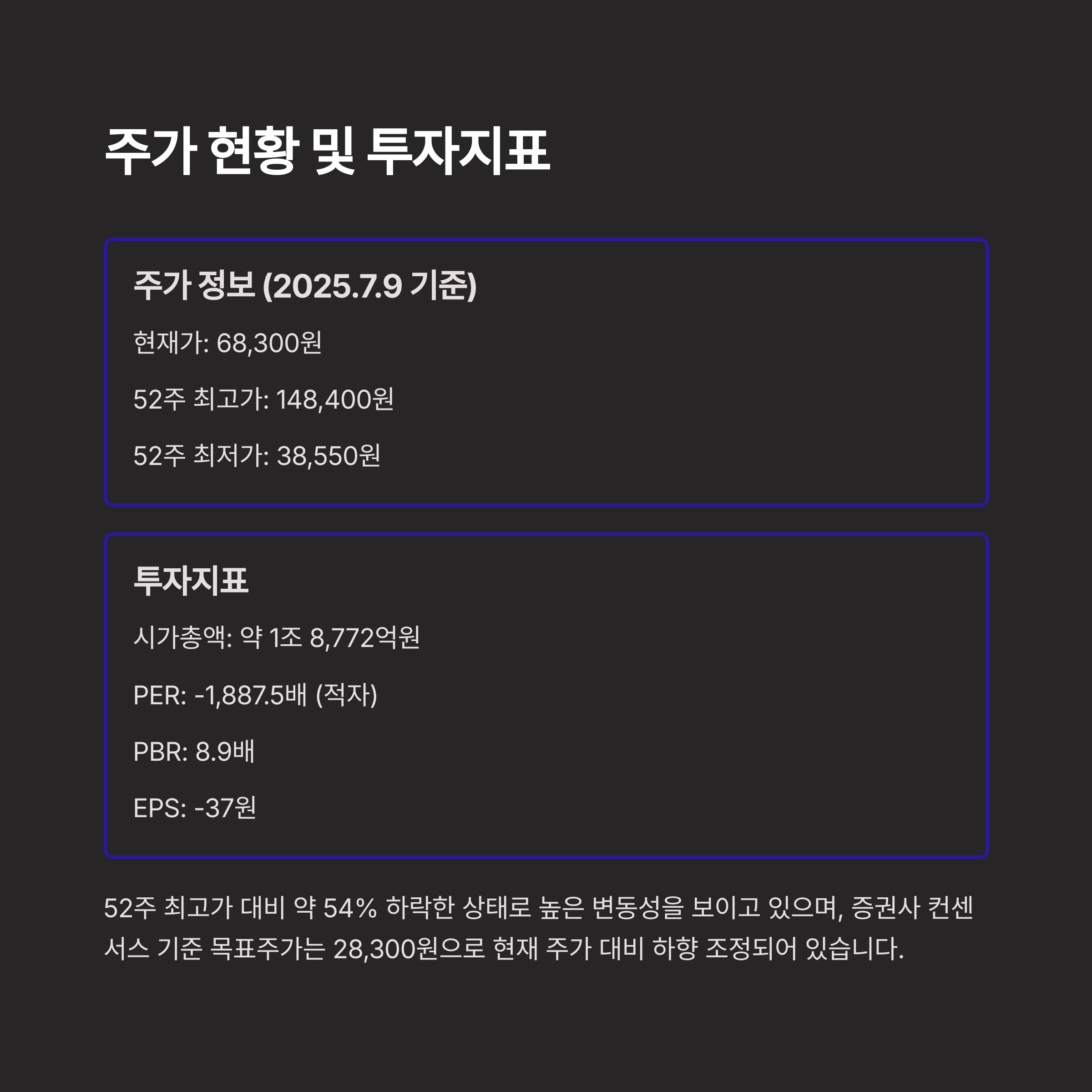 | 재무 | 매출 성장세 유지 | 순이익 적자, 높은 PBR |