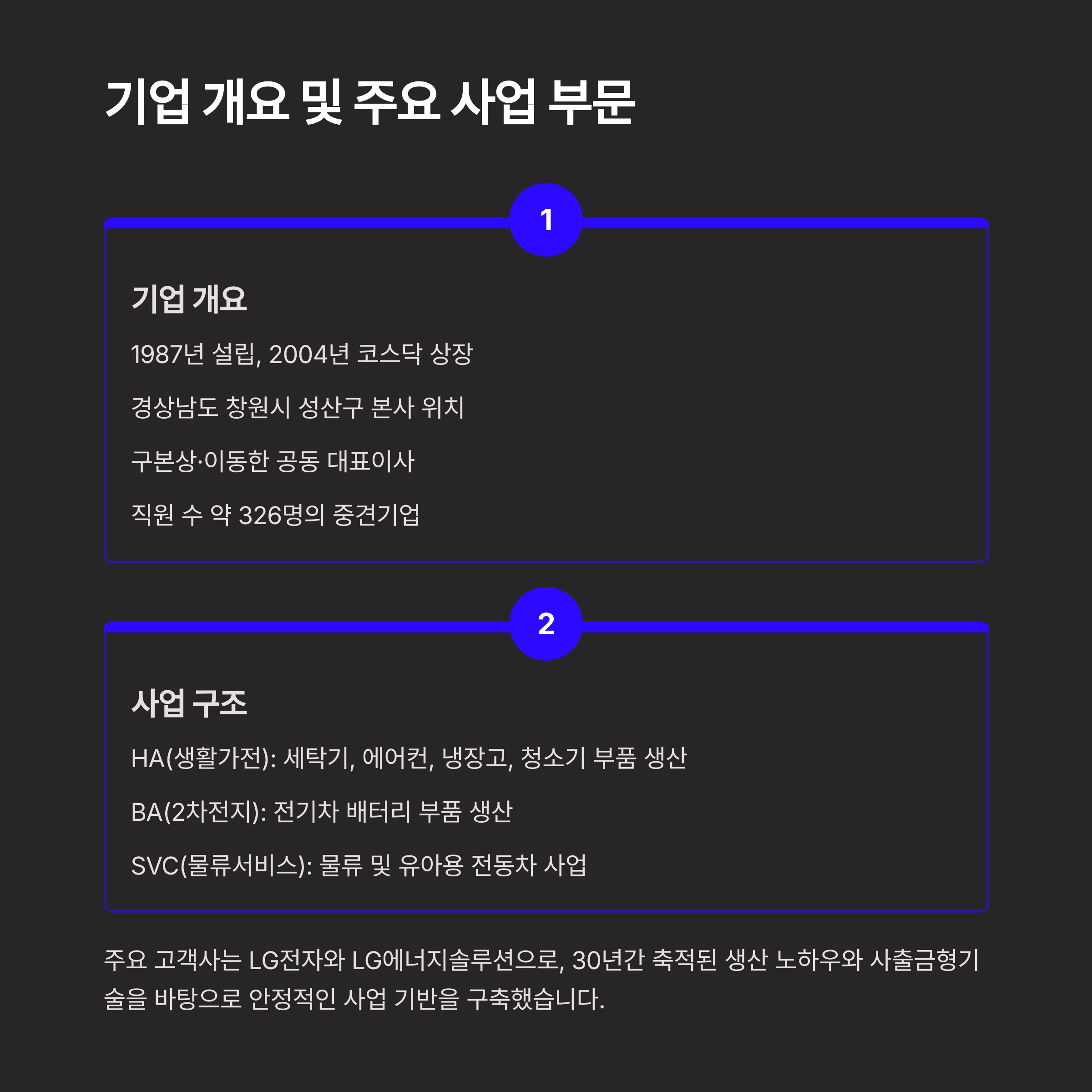LG전자의 세탁기, 냉장고, 청소기 부품을 공급해왔습니다. 그러나 미래 먹거리로