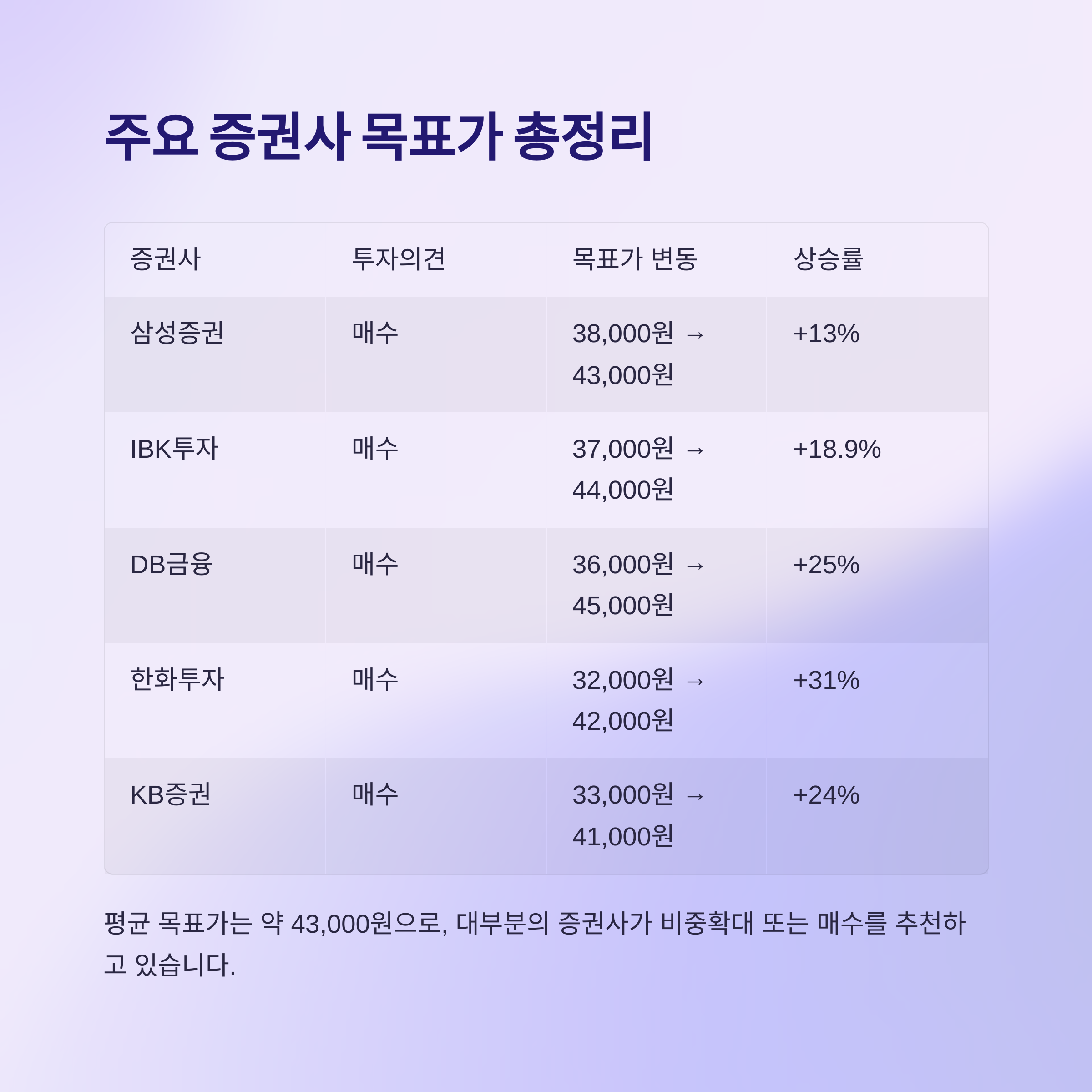 평균 목표가는 약 43,000원이며, 대부분의 증권사가 비중확대 또는 매수를 추천하고 있습니다.