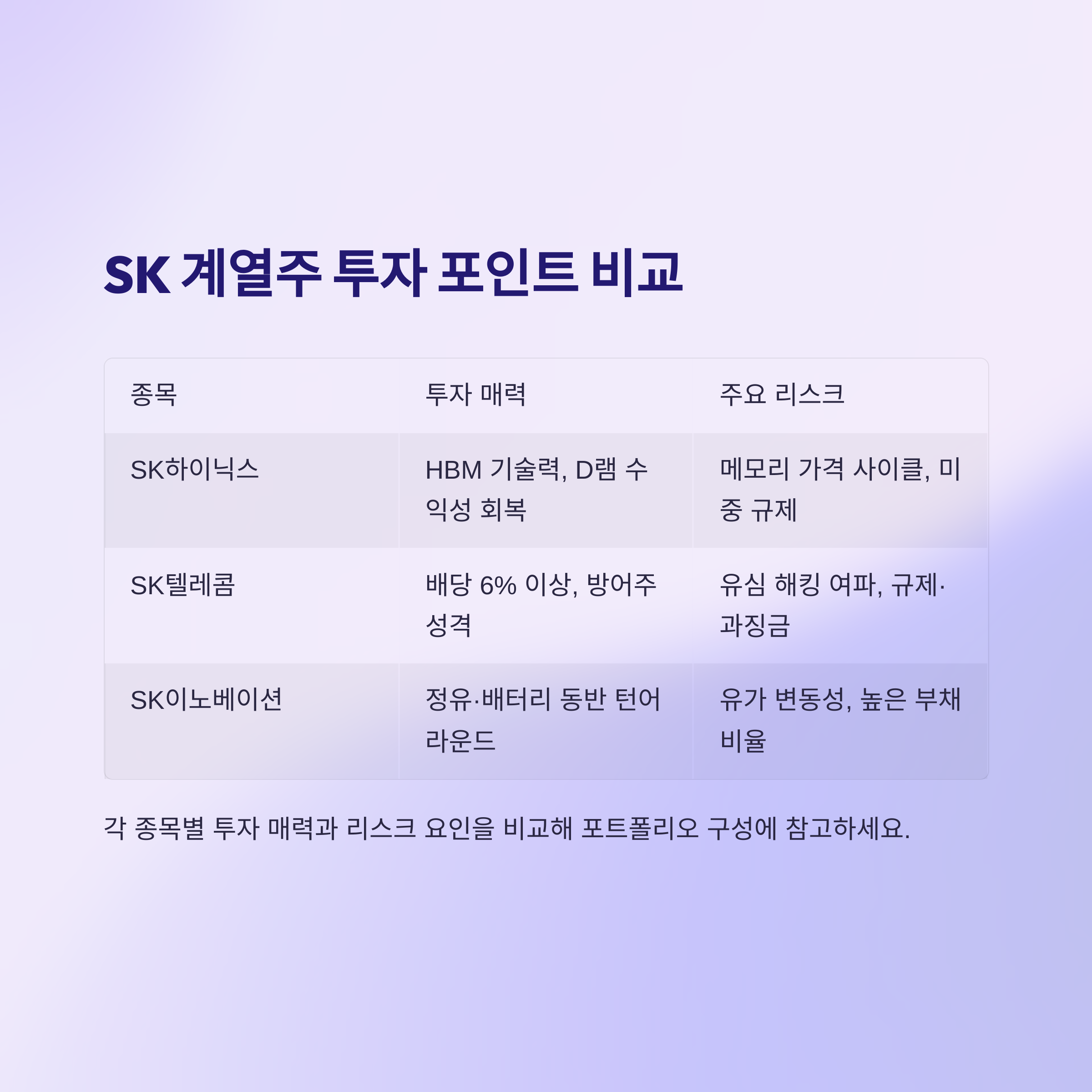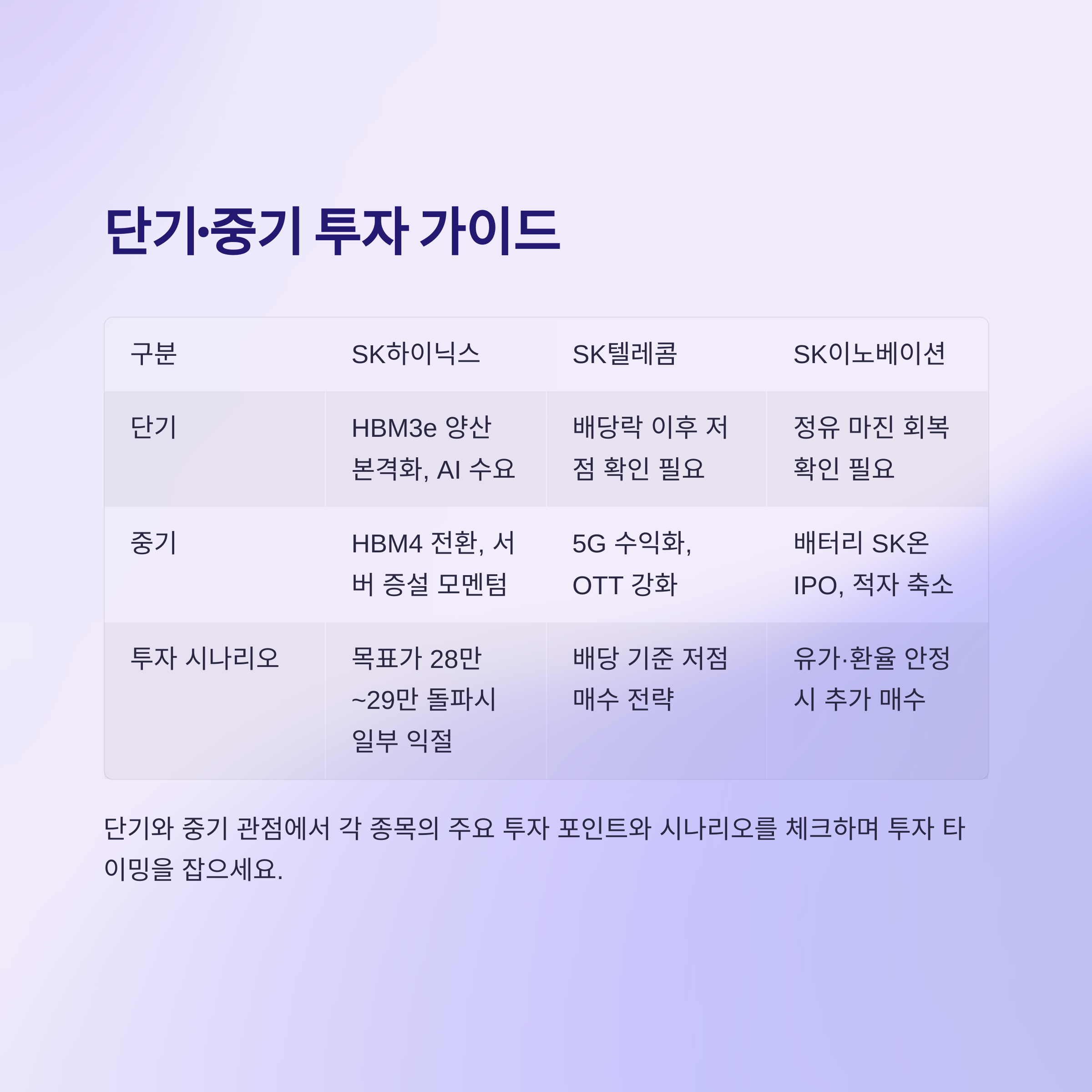 | 중기 | HBM4 전환, 서버 증설 모멘텀 | 5G 수익화, OTT 강화 | 배터리 SK온 IPO, 적자 축소 |