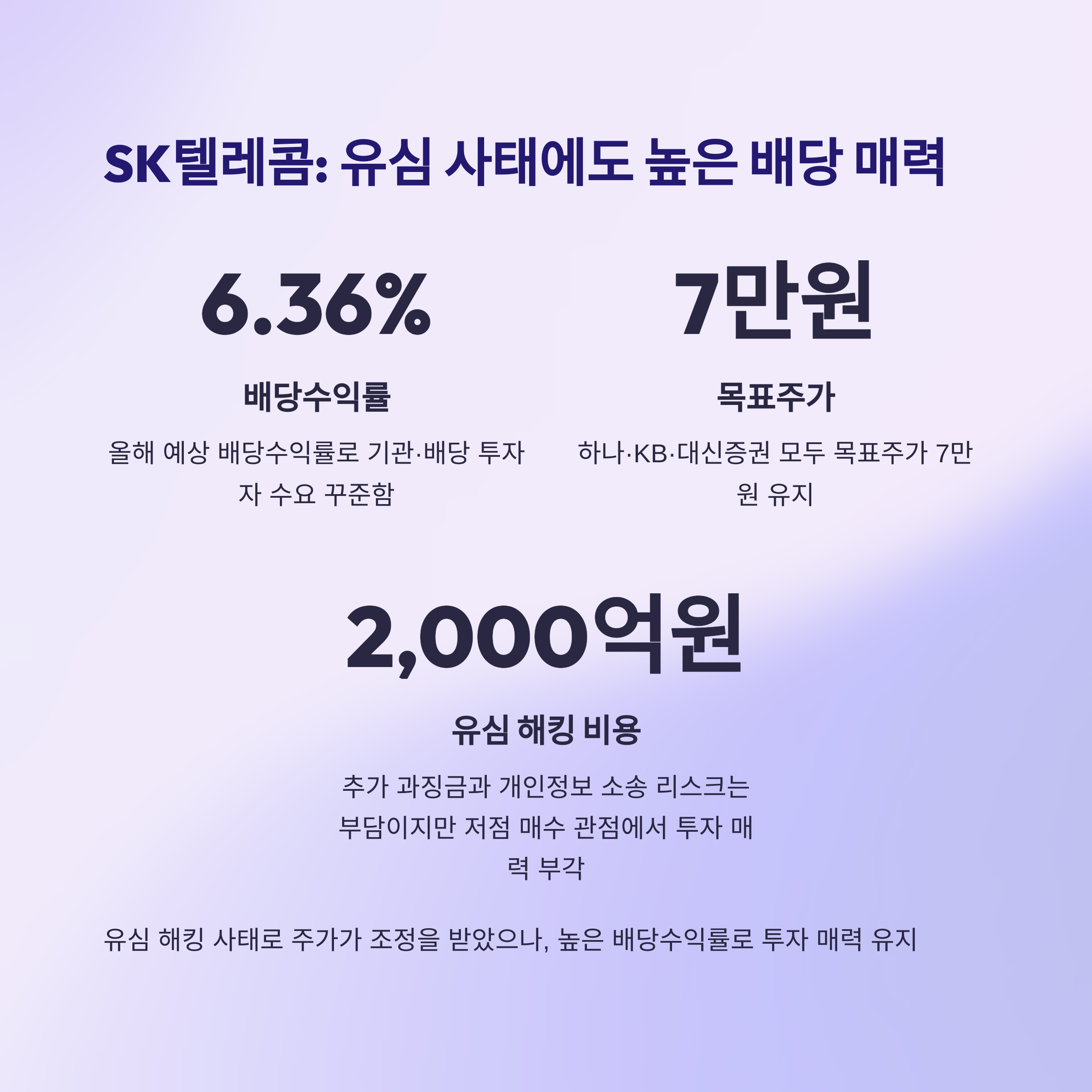 | SK텔레콤 | 배당 6% 이상, 방어주 성격 | 유심 해킹 여파, 규제·과징금 |