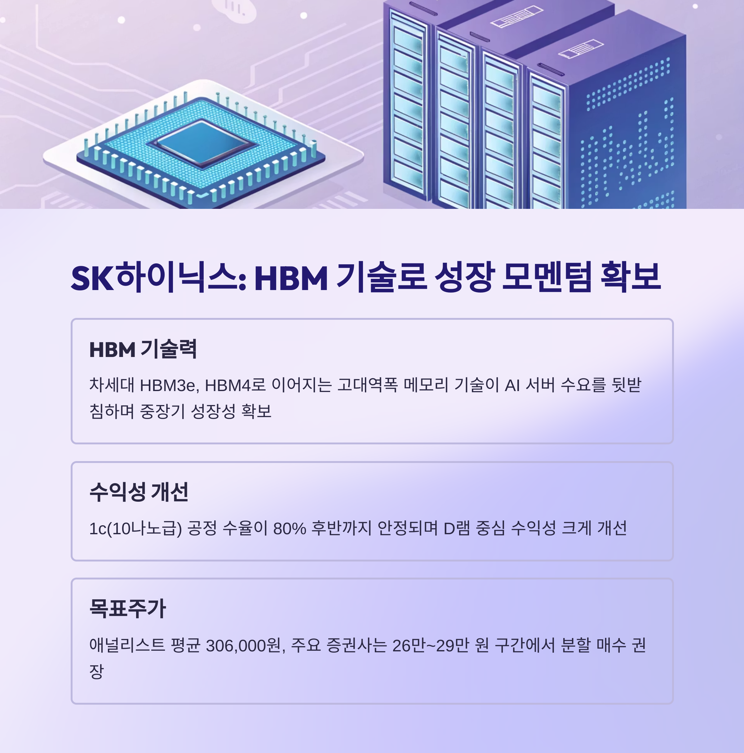 | SK하이닉스 | HBM 기술력, D램 수익성 회복 | 메모리 가격 사이클, 미중 규제 |