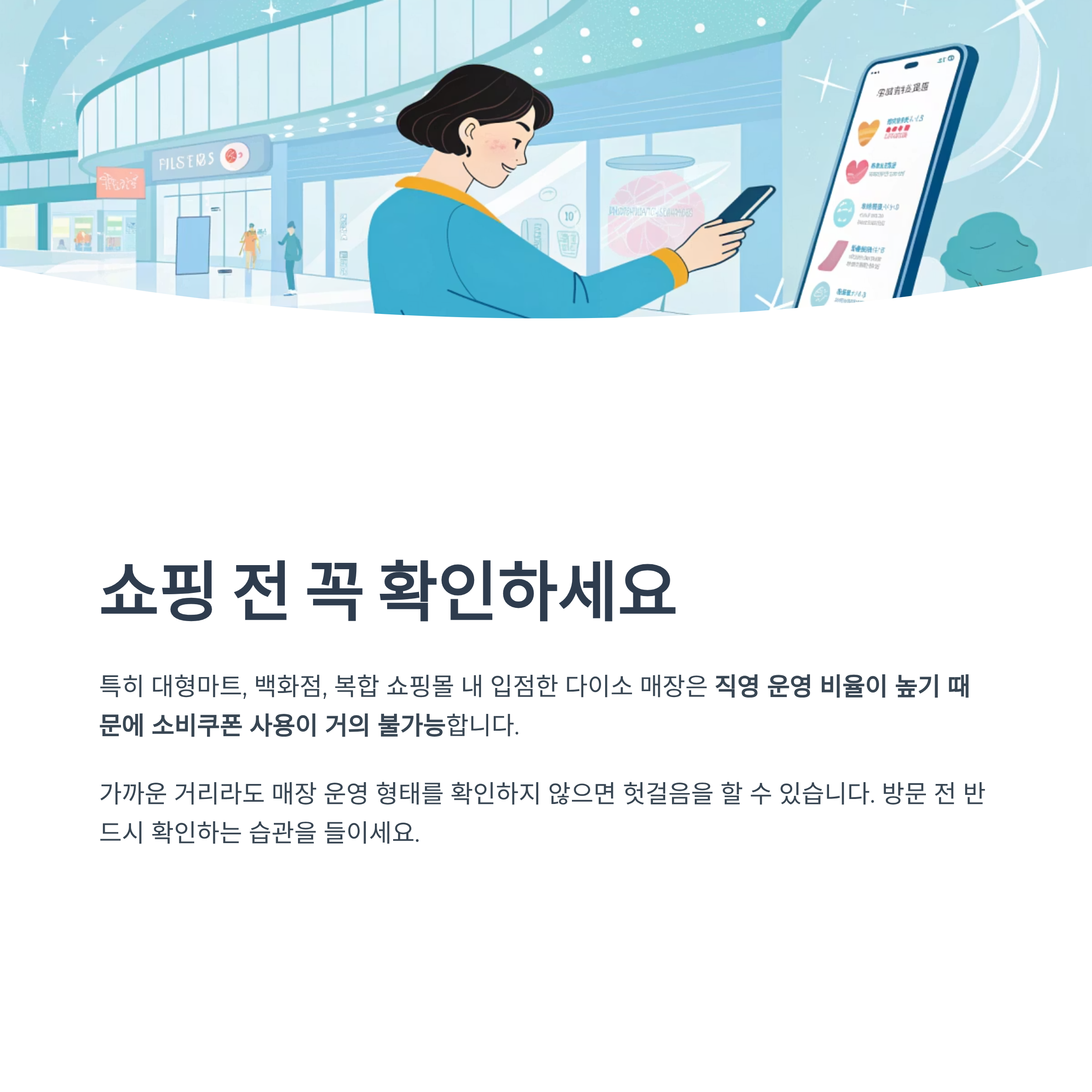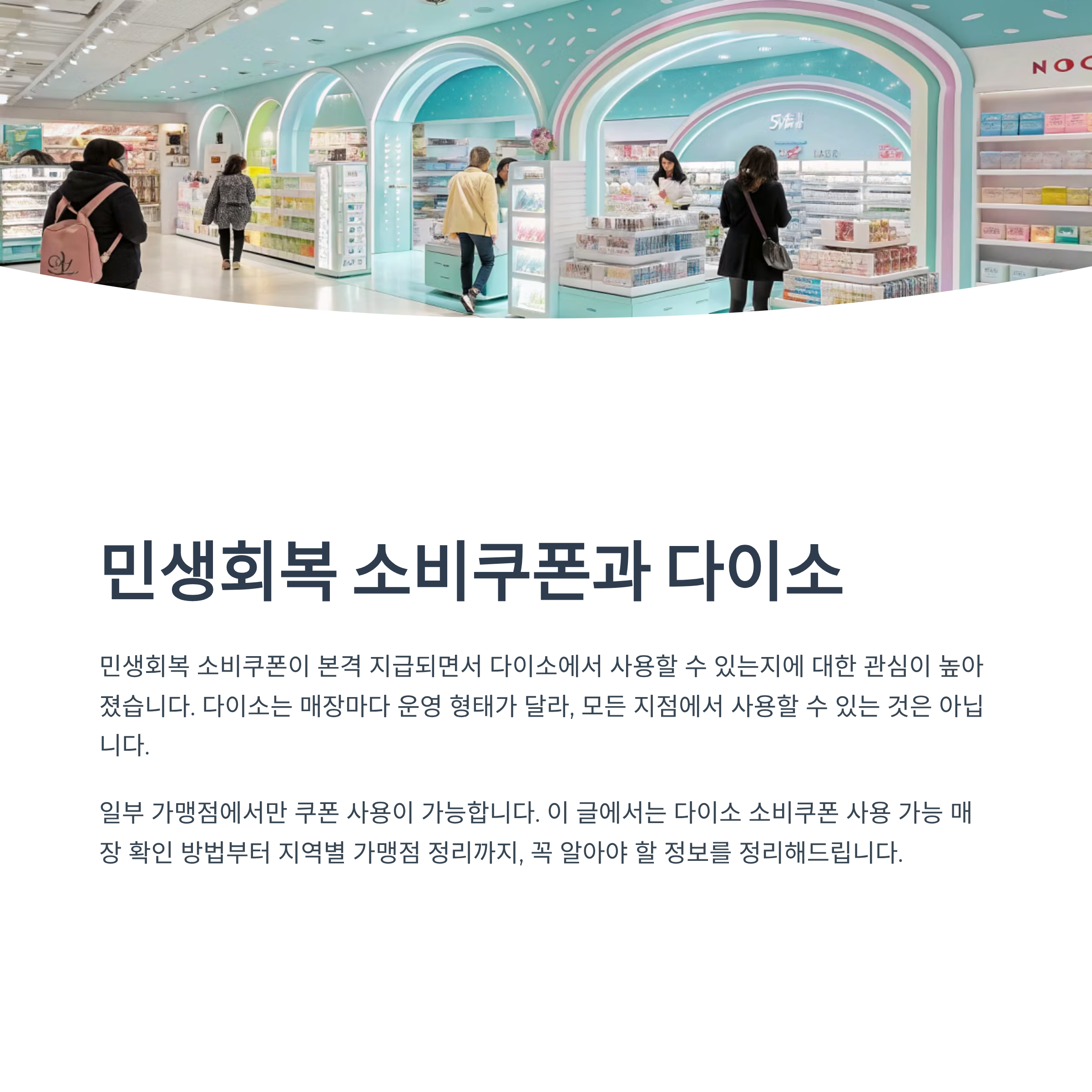 민생회복 소비쿠폰이 본격 지급되면서 다이소에서 사용할 수 있는지에 대한 관심이 높아졌습니다. 다이소는 매장마다 운영 형태가 달라, 모든 지점에서 사용할 수 있는 것은 아니며, 일부 가맹점에서만 쿠폰 사용이 가능합니다. 이 글에서는 다이소 소비쿠폰 사용 가능 매장 확인 방법부터 지역별 가맹점 정리까지, 꼭 알아야 할 정보를 정리해드립니다.