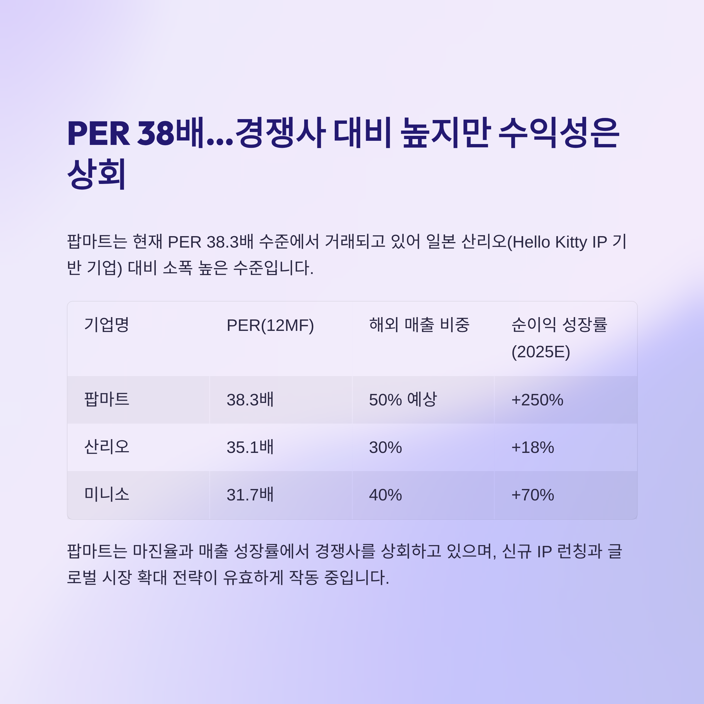 팝마트는 현재 PER 38.3배 수준에서 거래되고 있어 일본 산리오(Hello Kitty IP 기반 기업) 대비 소폭 높은 수준입니다. 그러나 팝마트는 마진율과 매출 성장률에서 경쟁사를 상회하고 있으며, 신규 IP 런칭과 글로벌 시장 확대 전략이 유효하게 작동 중입니다.