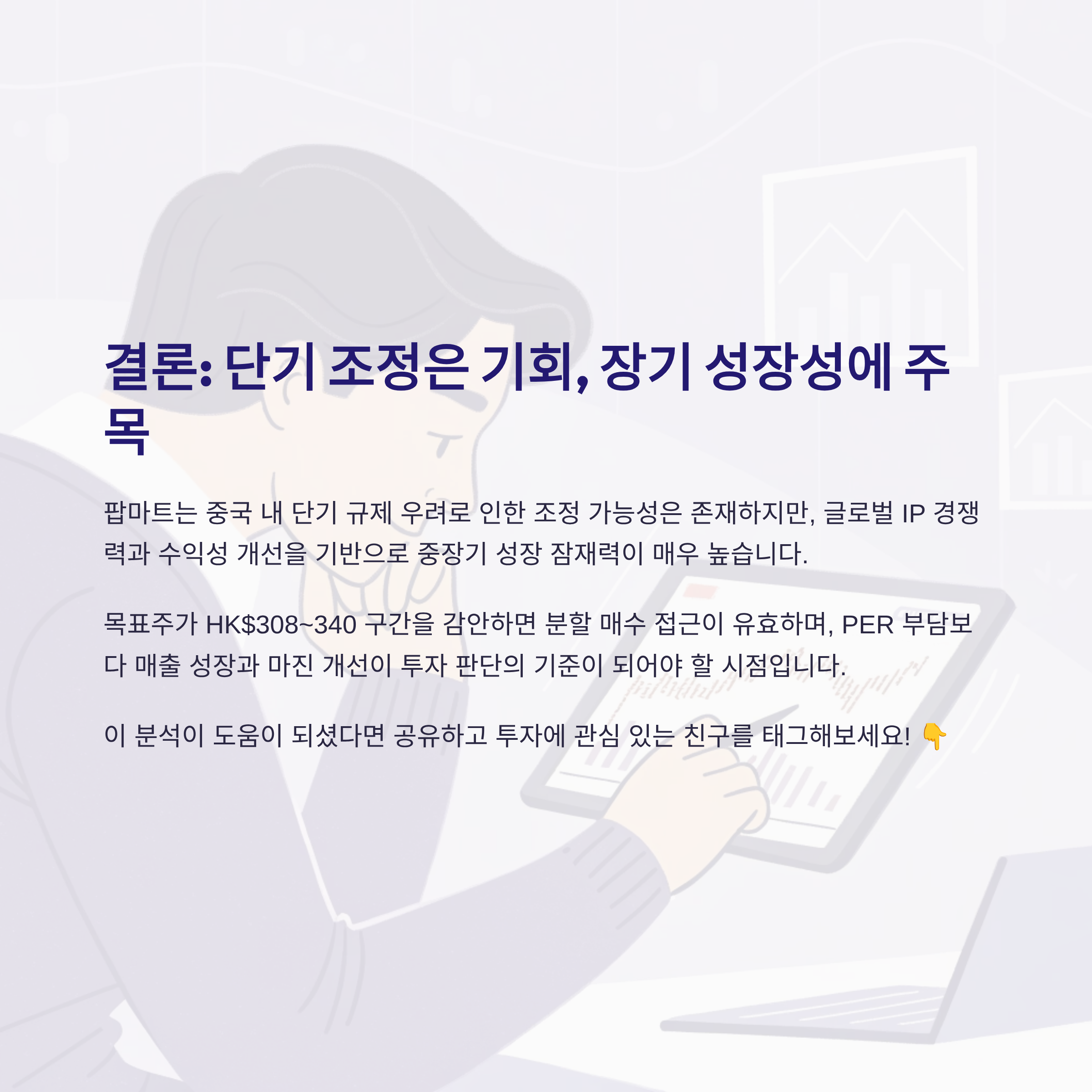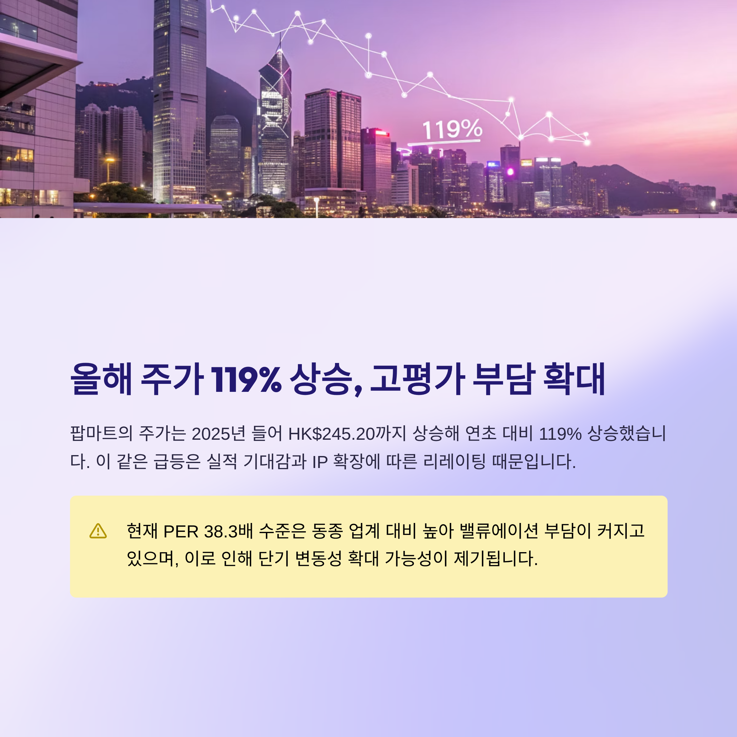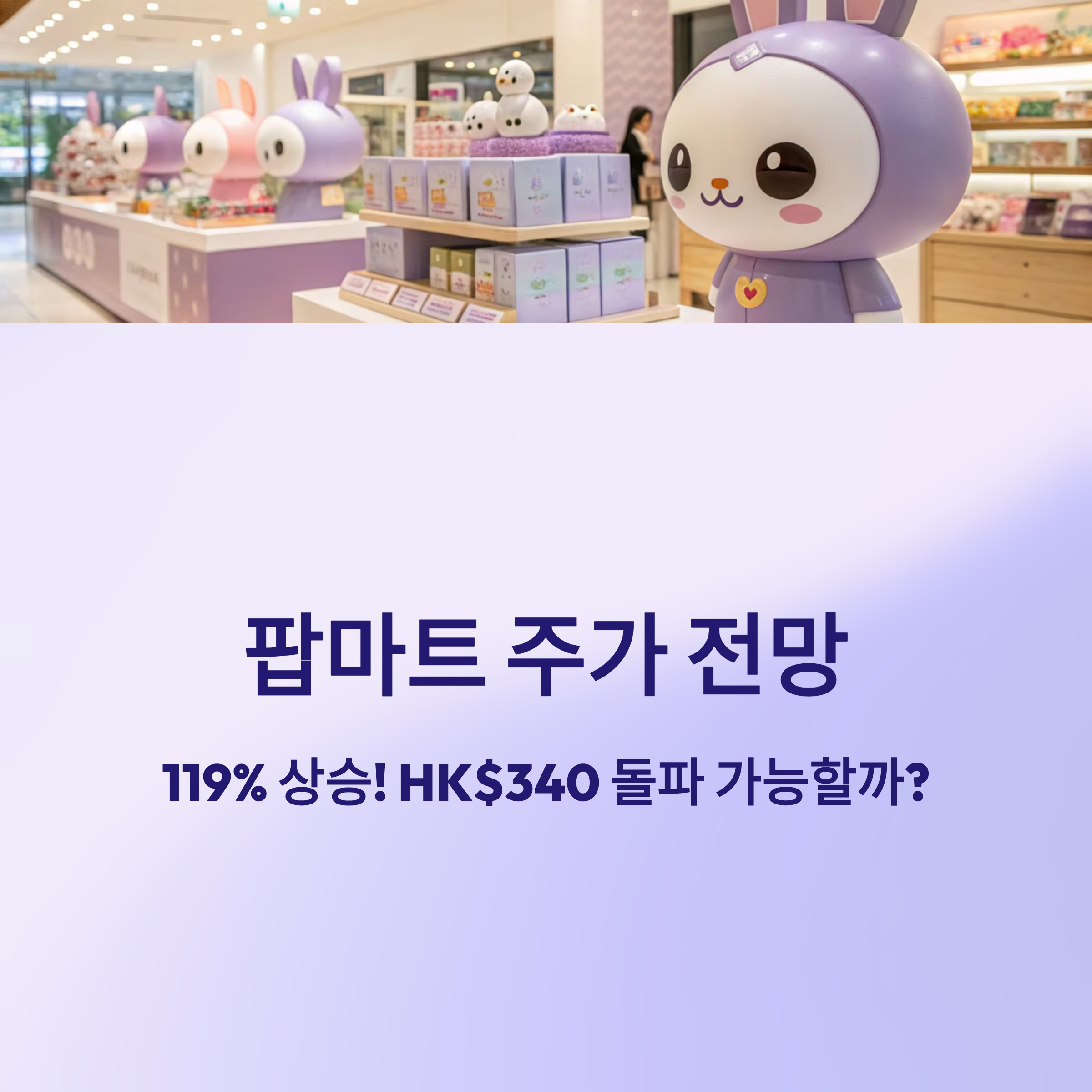 팝마트는 중국 내 단기 규제 우려로 인한 조정 가능성은 존재하지만, 글로벌 IP 경쟁력과 수익성 개선을 기반으로 중장기 성장 잠재력이 매우 높습니다. 목표주가 HK$308~340 구간을 감안하면 분할 매수 접근이 유효하며, PER 부담보다 매출 성장과 마진 개선이 투자 판단의 기준이 되어야 할 시점입니다.