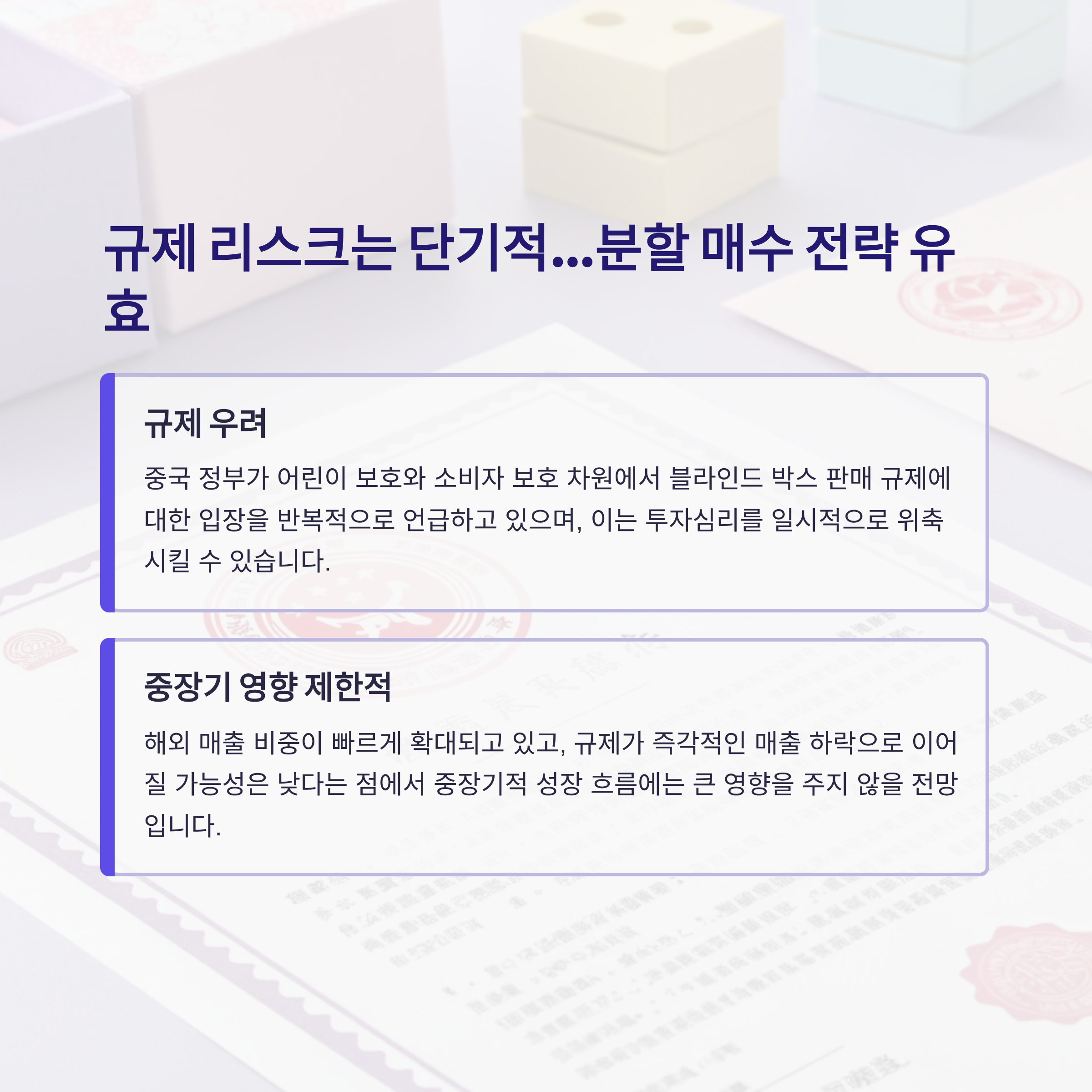 중국 정부가 어린이 보호와 소비자 보호 차원에서 블라인드 박스 판매 규제에 대한 입장을 반복적으로 언급하고 있으며, 이는 투자심리를 일시적으로 위축시킬 수 있습니다. 그러나 해외 매출 비중이 빠르게 확대되고 있고, 규제가 즉각적인 매출 하락으로 이어질 가능성은 낮다는 점에서 중장기적 성장 흐름에는 큰 영향을 주지 않을 전망입니다.