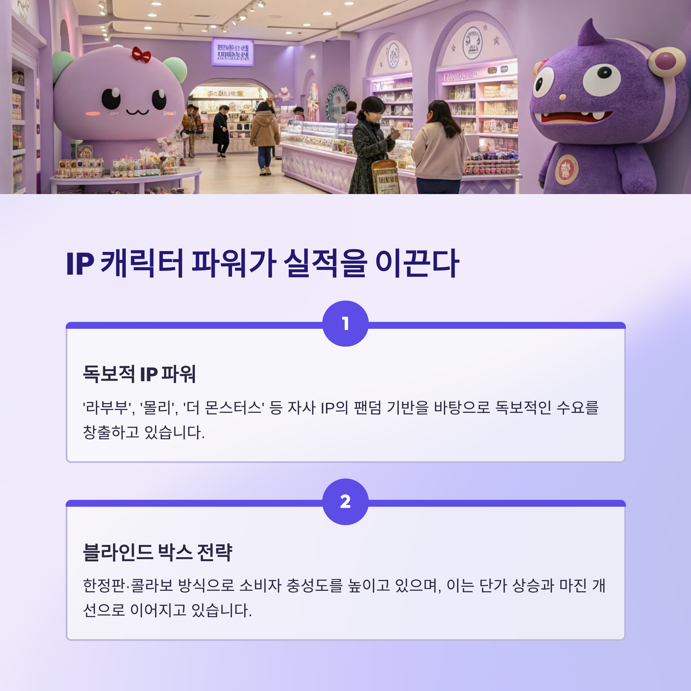 팝마트는 '라부부', '몰리', '더 몬스터스' 등 자사 IP의 팬덤 기반을 바탕으로 독보적인 수요를 창출하고 있습니다. 특히 블라인드 박스 모델은 한정판·콜라보 방식으로 소비자 충성도를 높이고 있으며, 이는 단가 상승과 마진 개선으로 이어지고 있습니다.