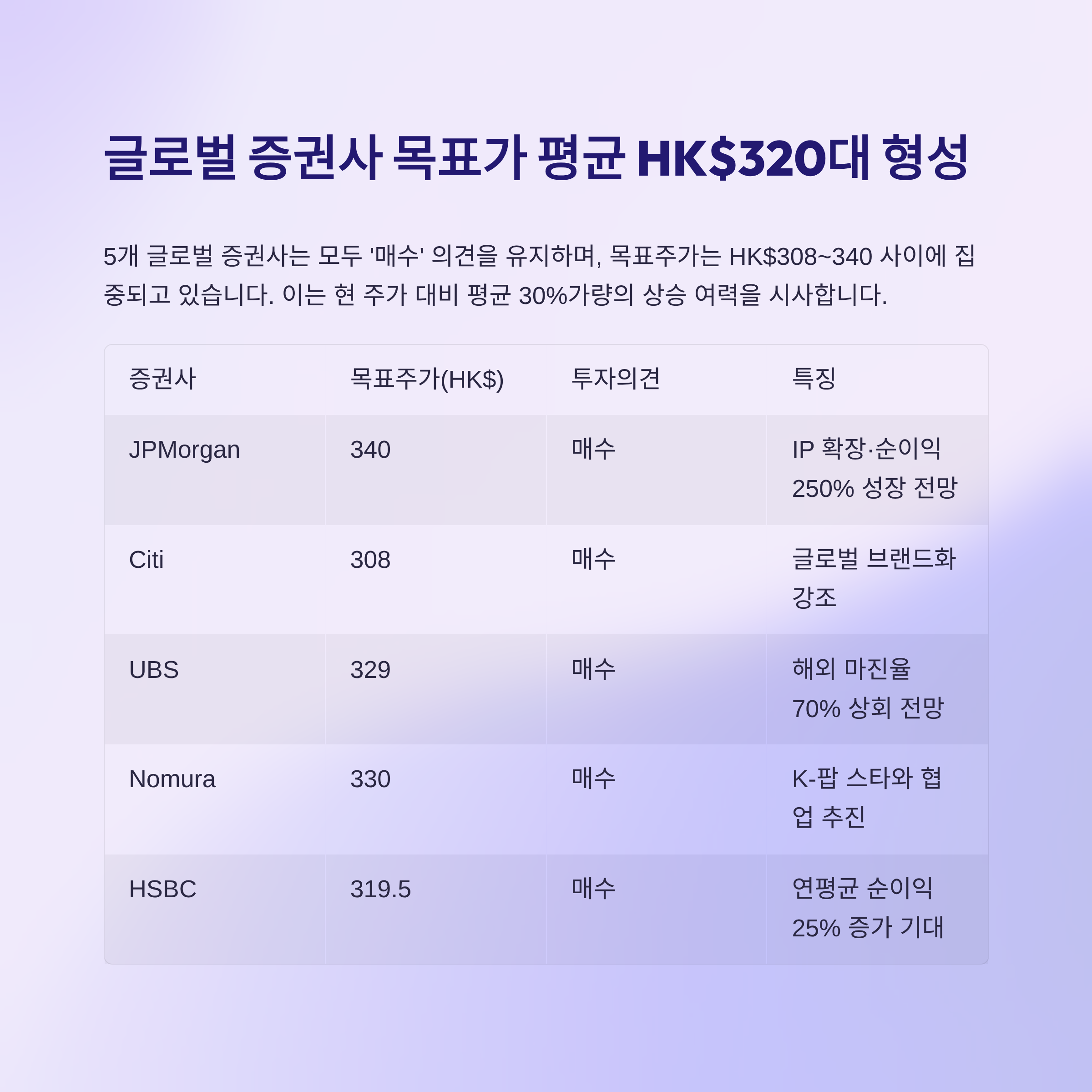 5개 글로벌 증권사는 모두 ‘매수’ 의견을 유지하며, 목표주가는 HK$308~340 사이에 집중되고 있습니다. 이는 현 주가 대비 평균 30%가량의 상승 여력을 시사합니다. 특히 UBS는 해외 마진율이 70%를 상회할 것이라며 가장 긍정적인 평가를 내놓았습니다.