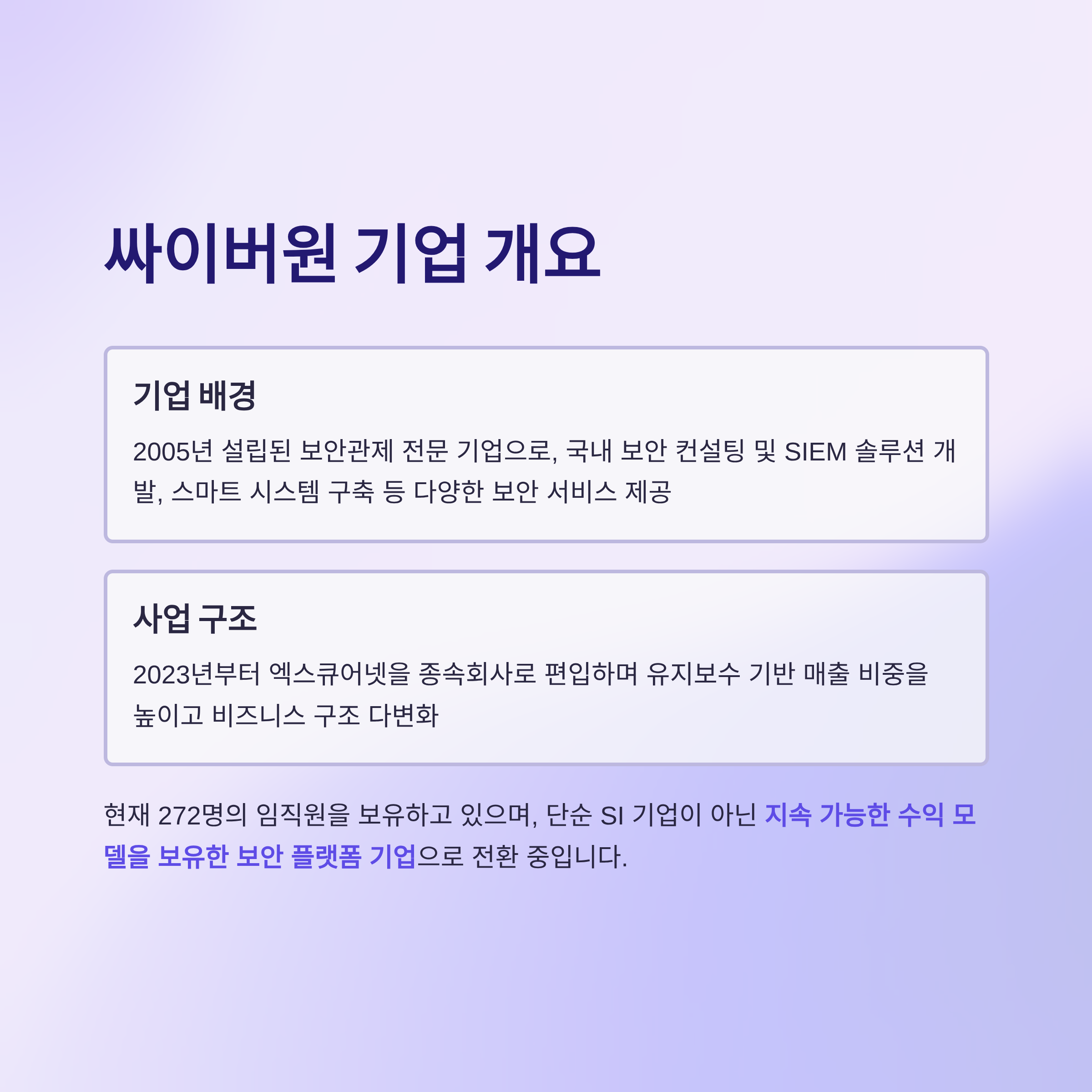 특히 2023년부터 엑스큐어넷을 종속회사로 편입하면서, 전통적인 프로젝트 기반 수익에서 벗어나 반복적인 유지보수 기반 매출 비중을 높이며 비즈니스 구조를 다변화하고 있습니다. 이는 싸이버원이 단순한 SI 기업이 아닌, 지속 가능한 수익 모델을 보유한 보안 플랫폼 기업으로 전환 중임을 시사합니다.