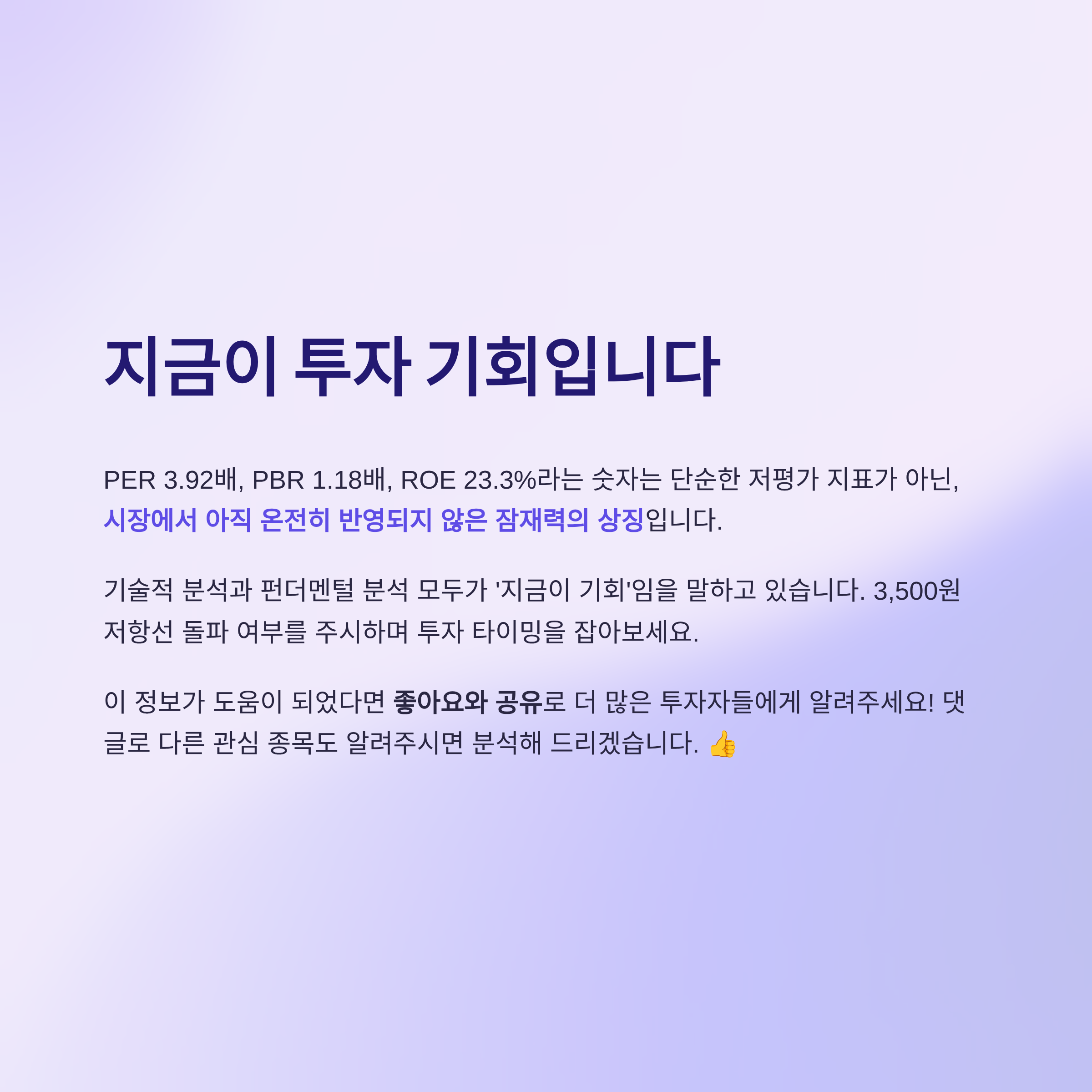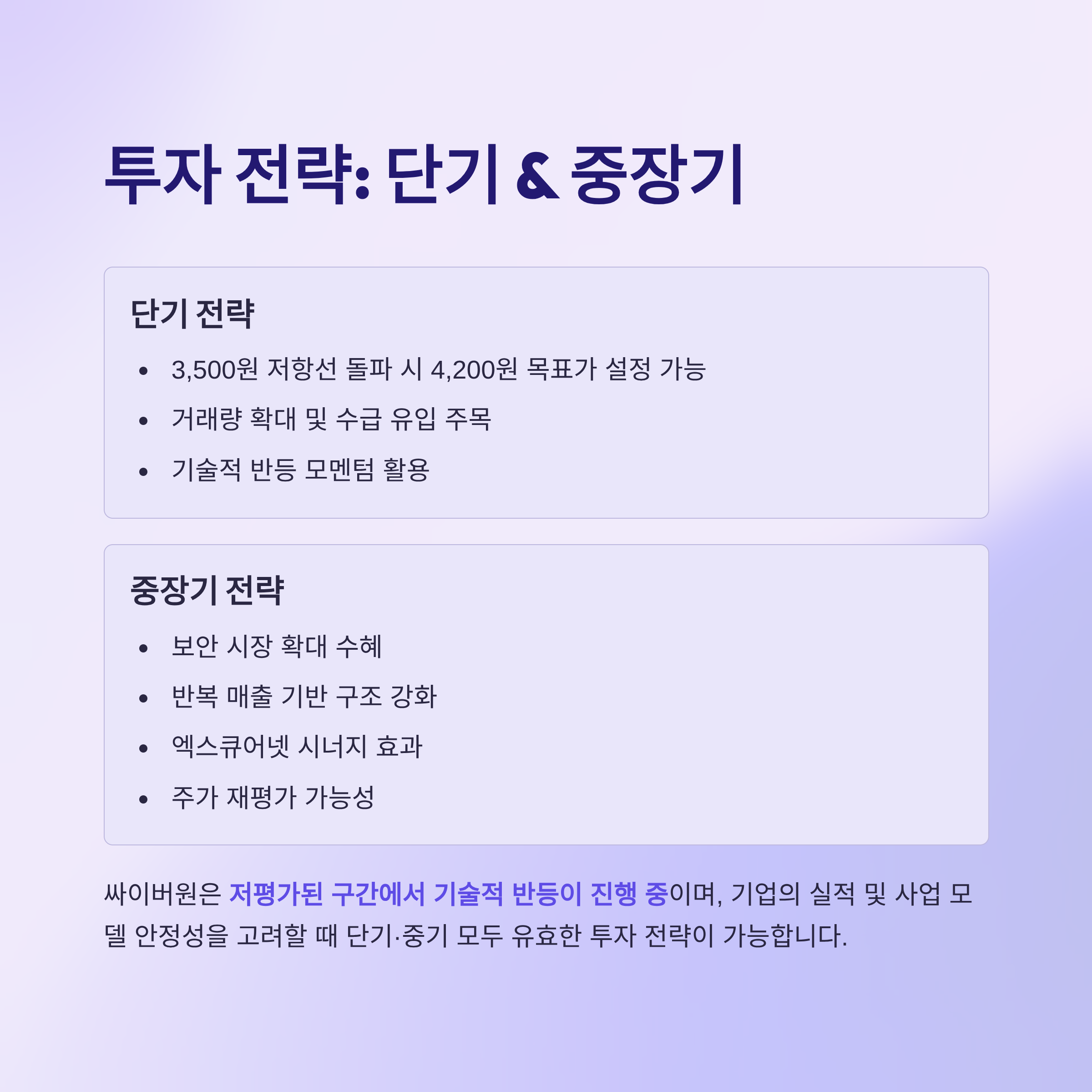 - 단기 전략: 3,500원 저항선 돌파 시 4,200원 목표가 설정 가능. 거래량 확대 및 수급 유입 주목.