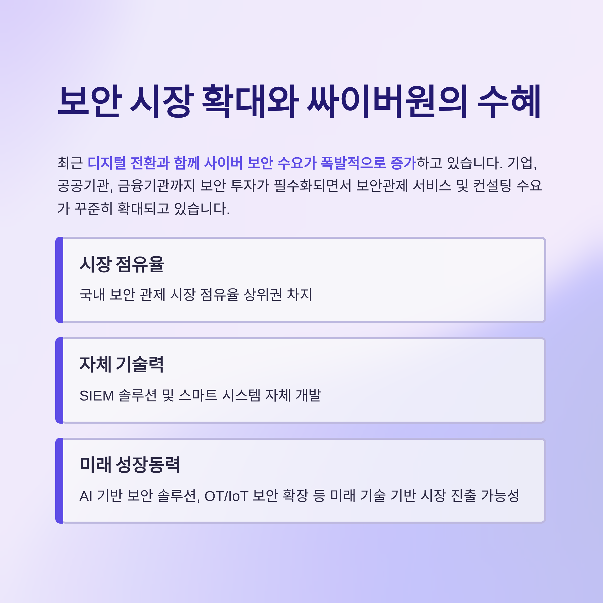 싸이버원은 이미 국내 보안 관제 시장 점유율 상위권을 차지하고 있으며, SIEM 솔루션 및 스마트 시스템을 자체 개발하고 있어 시장 확대의 직접적 수혜를 받을 수 있는 구조입니다. 향후 AI 기반 보안 솔루션, OT/IoT 보안 확장 등 미래 기술 기반의 시장으로 진출할 경우, 장기 성장 동력 확보도 기대됩니다.