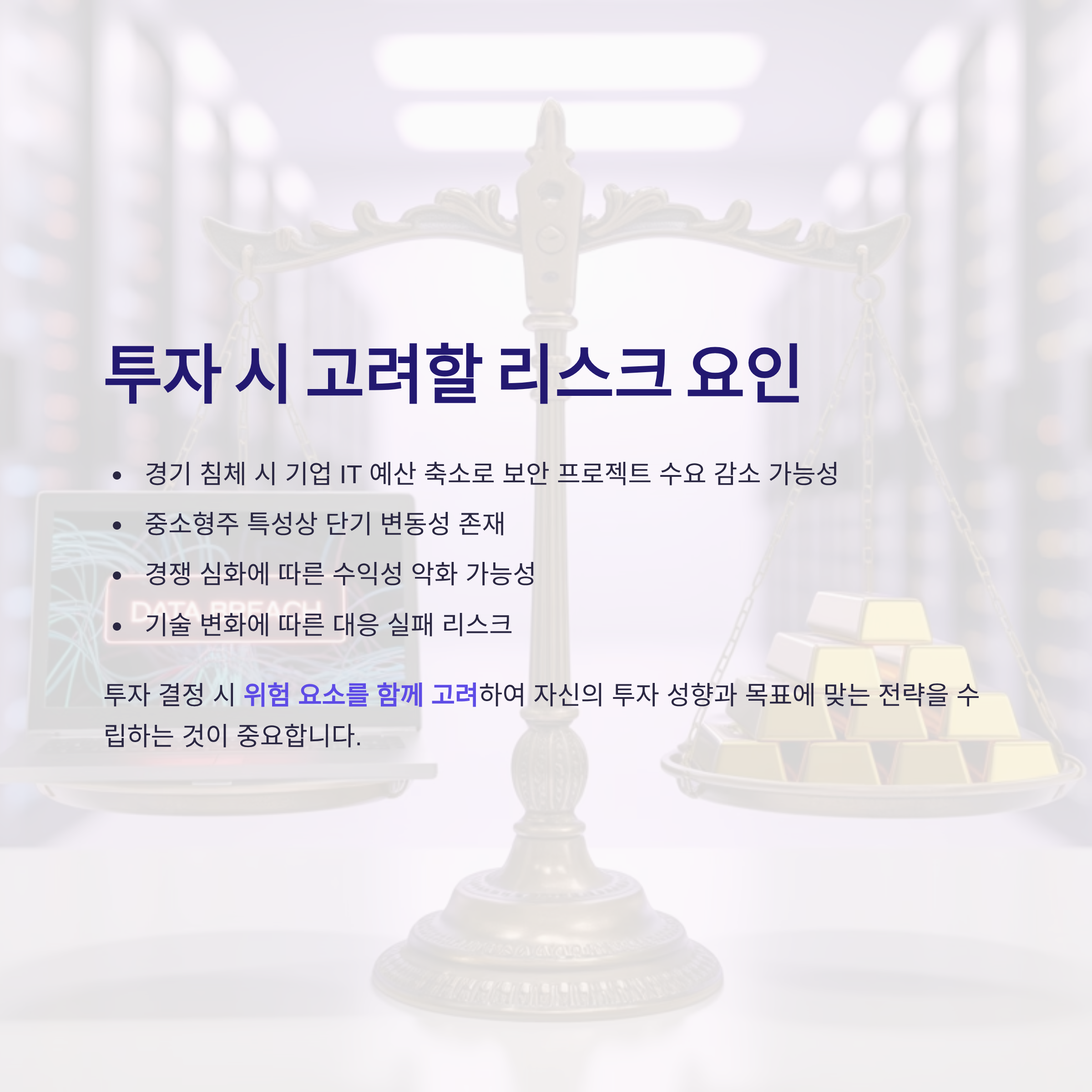 하지만, 투자 시 고려해야 할 리스크 요인도 있습니다. 경기 침체나 기업 IT 예산 축소는 보안 프로젝트 수요 감소로 이어질 수 있으며, 중소형주의 특성상 단기 변동성 역시 감안해야 합니다.