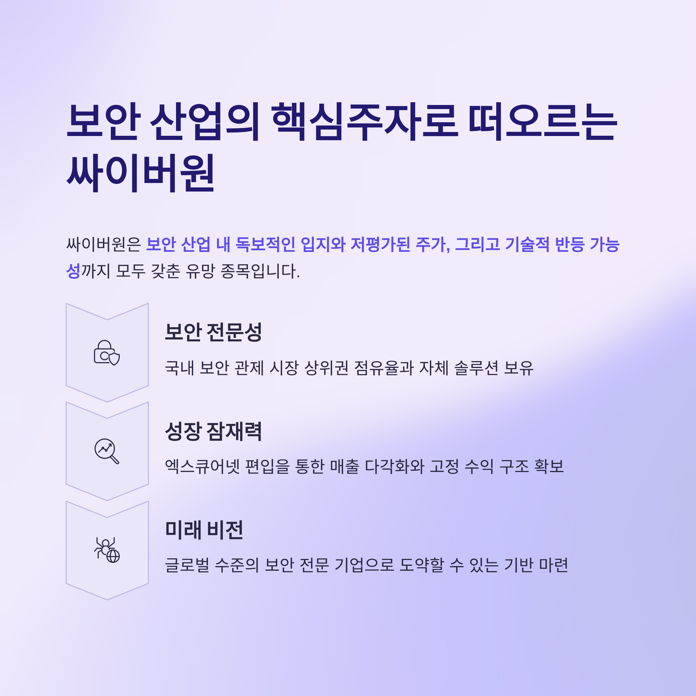싸이버원은 보안 산업 내 독보적인 입지와 저평가된 주가, 그리고 기술적 반등 가능성까지 모두 갖춘 유망 종목입니다. 엑스큐어넷 편입을 통한 매출 다각화와 고정 수익 구조 확보는 향후 실적 안정성과 성장성에 긍정적인 영향을 줄 것으로 예상됩니다.